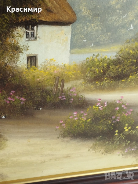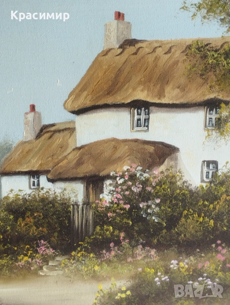 Една оригинална маслена картина на английска къща със сламен покрив. Подписана и рамкирана и е с размери 58 /48 см.