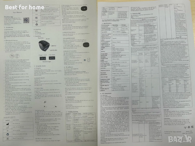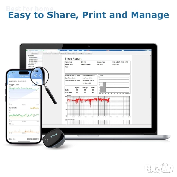 Подробни отчети от приложението и компютъра: Безплатното приложение и компютърният софтуер предоставят графични O2, PR отчети и тенденции в данните. Неограничено споделяне на PDF и CSV отчети. Приложението е съвместимо с iOS 9.0 или по-нова версия, iPhone 4s/iPad 3 или по-нова версия, Android 5.0 или по-нова версия, с Bluetooth 4.0 BLE.