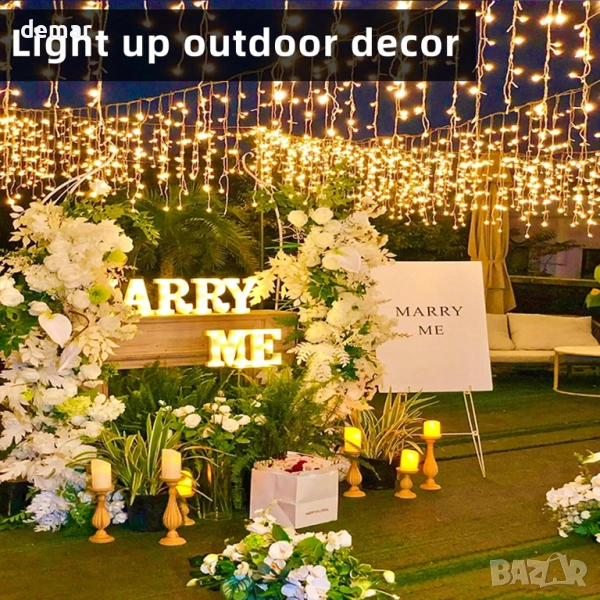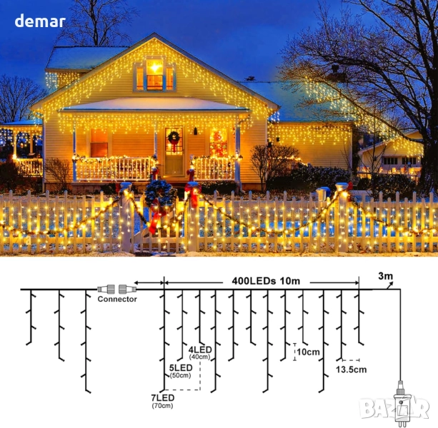 Тези 10-метрови гирлянди от висулки разполагат с 400 топло бели светодиода с осем режима на осветление, вграден таймер и функция за памет. Захранвани от безопасен 29V щепсел с 3-метров кабел, те са идеални за декориране на прозорци, покриви или вътрешни пространства, създавайки уютна празнична светлина с лесна и надеждна работа през целия празничен сезон.