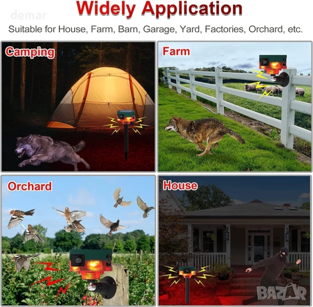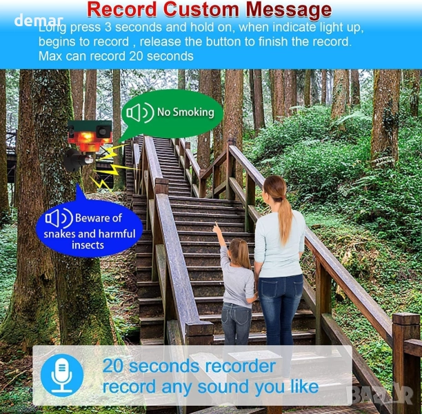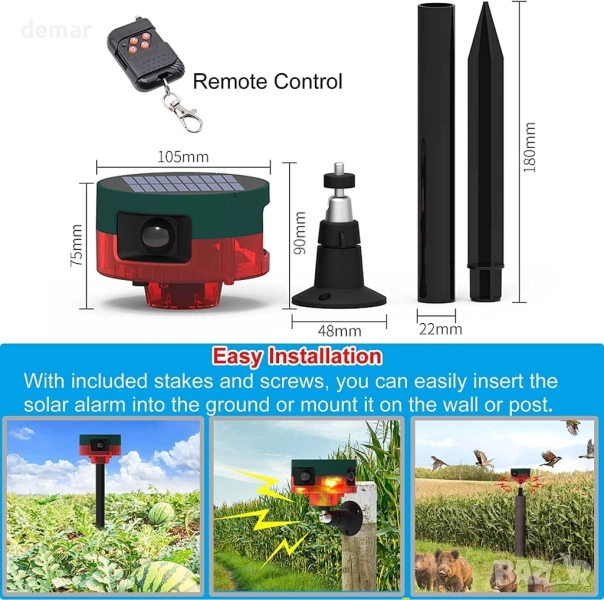 Тази соларна аларма със сензор за движение 360° открива движение в радиус от 5 до 8 метра и активира сирена от 129dB с ярки стробоскопични светлини, за да отблъсне животни и натрапници. Предлага двойни опции за зареждане чрез слънчева енергия или DC вход, осигурявайки надеждна работа дори в облачни дни. С функция за дистанционно управление, тя осигурява множество режими на работа, включително 24-часова или само нощна работа. Устройството включва 13 вградени алармени звука и позволява до 20 секунди персонализиран запис за персонализирани сигнали. Проектирана с водоустойчива защита IP55, тя е лесна за работа и идеална за осигуряване на домове, ферми, гаражи, училища и други открити пространства.