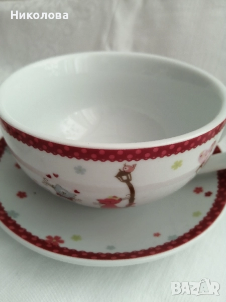 Комплектът е с детски мотиви. Предназначен за запарване на чай. Вместимостта на каничката е 400 мл. Чашката събира малко повече от 200 мл.