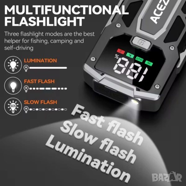 Слагаме край на бустерите за подаване на ток с интегриран компресор за помпане на гуми. В предлагания тук бустер, на мястото на механизма на компресора, има още литиево-йонни елементи за осигуряване на по-силен стартов ток. Акумулаторни напълно автоматизирани компресори предлагаме отделно - разгледайте и другите ни обяви.