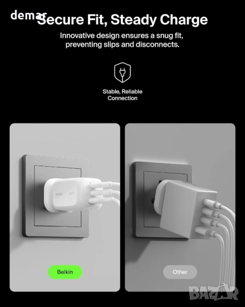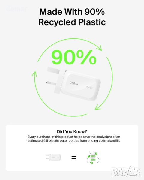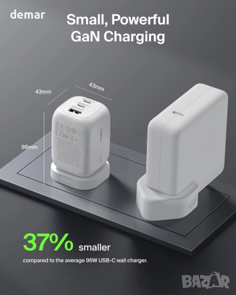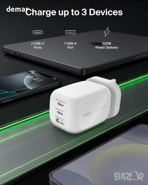 Това 100W GaN зарядно устройство позволява едновременно зареждане на до три устройства с два USB-C порта и един USB-A порт. То поддържа бързо зареждане чрез Power Delivery и PPS, като ефективно захранва лаптопи, телефони и таблети, като същевременно минимизира топлината. Универсално съвместимо с всички PD-съвместими устройства, то е компактно, леко и идеално за пътуване, със сменяеми накрайници за употреба по целия свят. Изградено с технологията Belkin SmartProtect, то предлага защита от пренапрежение и е преминало обширни тестове за безопасност, за да гарантира надеждно и сигурно зареждане на всички ваши устройства.