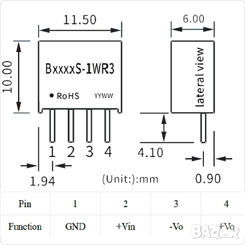 B1205S-1WR3 - 3.30 лв /1500VDC,Input 12V,Output 5V,Output Current 200mA max/20mA min,1 W/