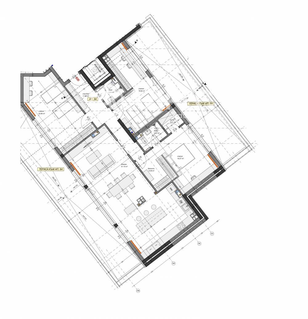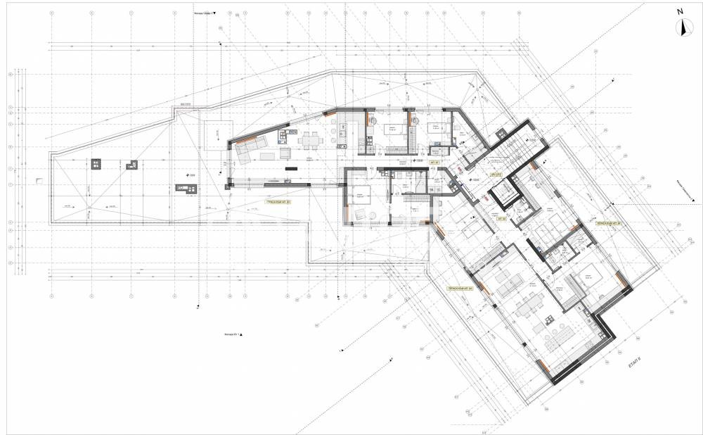 Многостаен апартамент състоящ се от: коридор, кухня, дневна с трапезария, три спални, две бани с тоалетна, килер, дрешник, две тераси. Има възможност за закупуване на гараж или паркомясто.