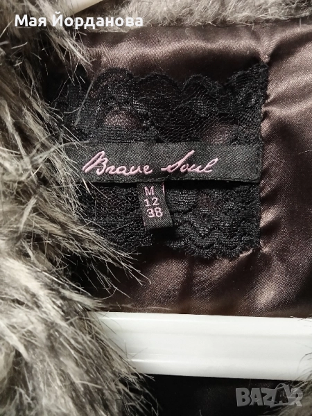 Късо еко-палто на британската марка Brave Soul за дизайнерска мода, сиво, размер М, L, цена 48 лв. в перфектно състояние. Дължина на ръкава 43 см. гръдна обиколка 102 см/ 51 см едностранно, дължина на палтото 58 см.