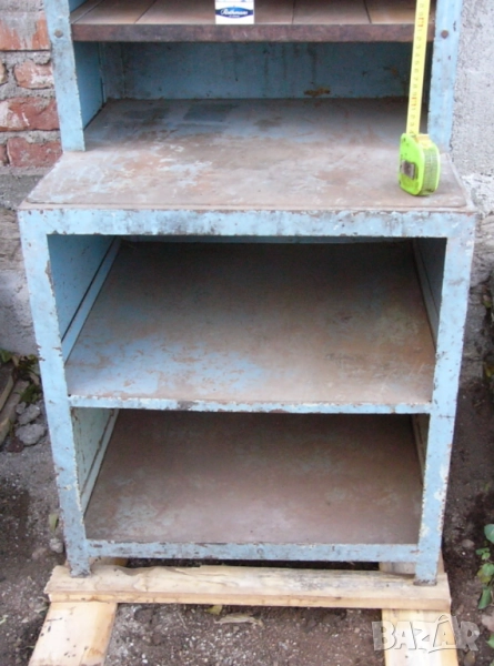 Поръчково направен по проект за авторемонтна работилница - изцяло стоманена конструкция от винкел 37x37 мм и ламарина 1,5 мм. Стабилен дизайн с висока товароносимост - масивна метална конструкция с 4 опорни крака, изпъкнал работен плот за монтаж опционални принадлежностии приспособления. Затворени стени, гръб, дъно и таван (горен плот), 9 бр. рафтове (вкл. 3 междинни демонтируеми) за съхранение на материали, части, детайли, металорежещи инструменти и консумативи и др.