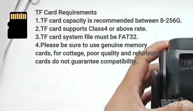 * поддържа запис върху microSD до 256GB class10 (карти памет се поръчват отделно). При запълване на картата новите клипове се правят върху старите, започвайки от най-далечната предишна дата. Гледане и изтегляне на видеозаписи става през приложение на мобилния телефон. Срещу заплащане може да се използва и облачна услуга с различни планове по избор.