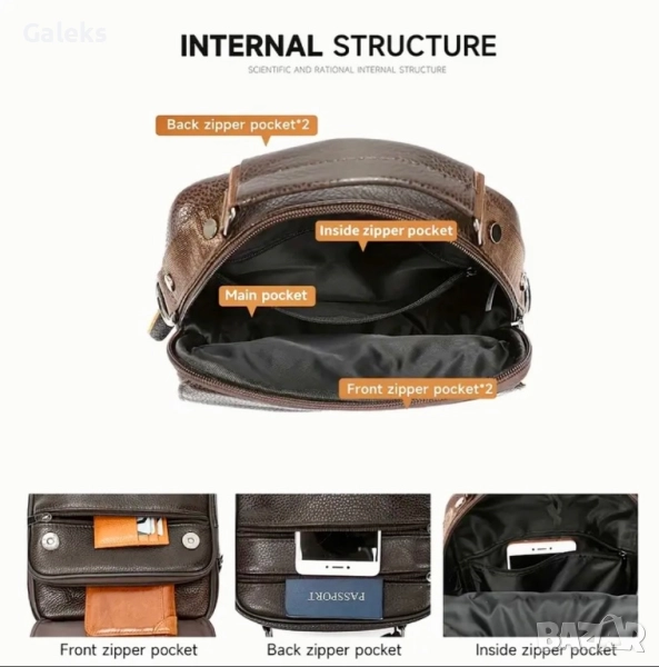 Снабдена с две удобни основни отделения покрити от дизайнерският капак с подредени 4 броя здрави ципове отпред отгоре и отзад.