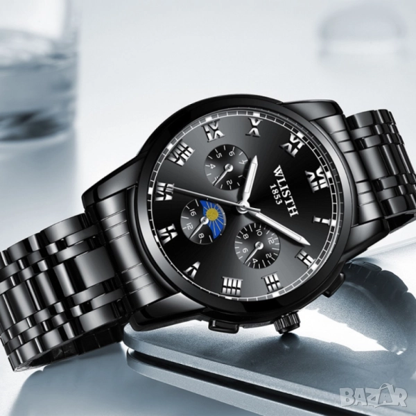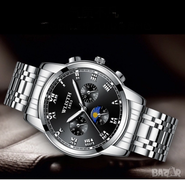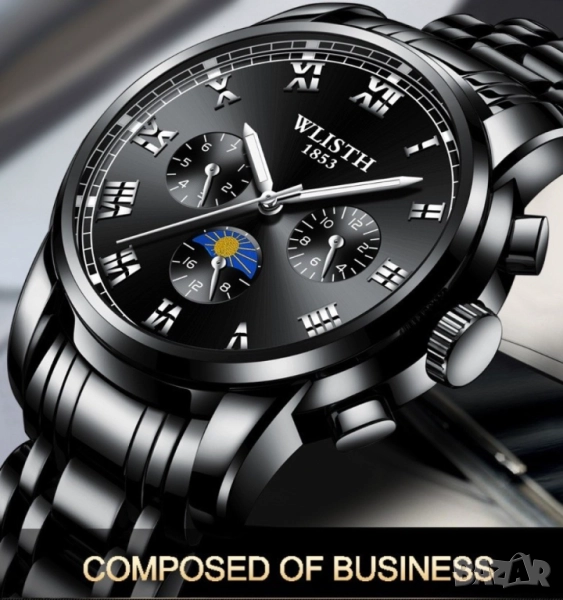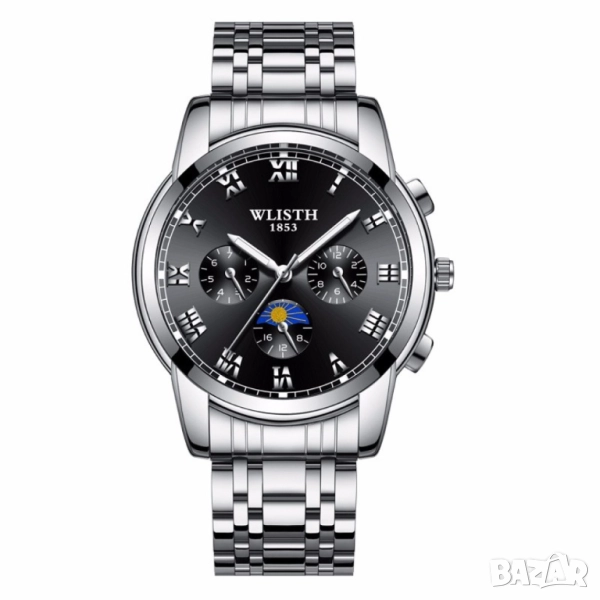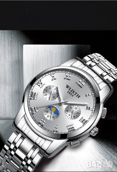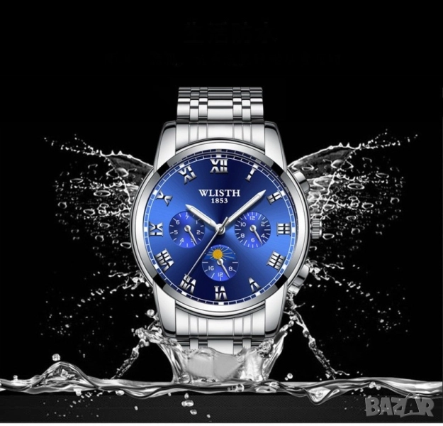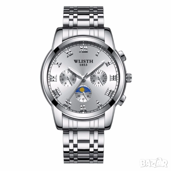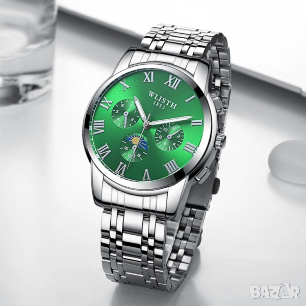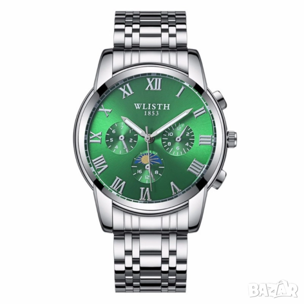 Изискан мъжки бизнес часовник с метален корпус. Висококачествена стомана със сребърно покритие. Кварцов механизъм. Покритие на циферблата против надраскване. Подсветка на циферблата. Функция календар. Водоустойчив до 30 метра. Размер на циферблат: 41 мм.; Дължина на верижката: 22 см.; Ширина на верижката: 2 см.; Дебелина на часовника: 11 мм. Гаранция - 1 година. Цветове - черен, бял , син и зелен.