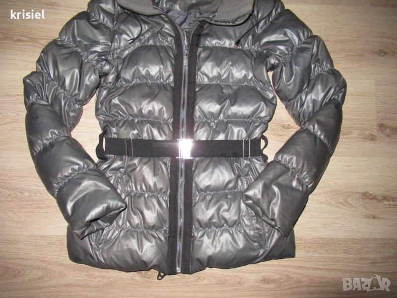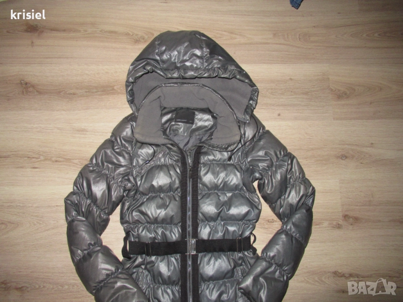 Якето е отлично.Номер 36/38.Много красиво и топло яке.Изцяло с пълнеж от гъши пух.Вталена елегантна кройка.Размерите са:дължина-64см,гръдна-46см,талия-42,ханш-48см