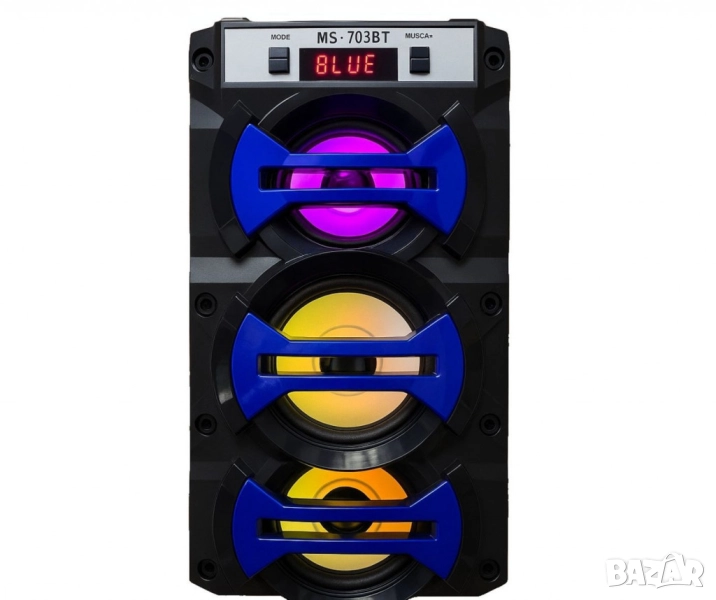 Колона MS-703BT - навсякъде с вас! Свързва се чрез Bluetooth. Говорители - 3 бр. Мощност - 12 W. LED дисплей. Размери - 200 х 140 х 400 мм. Тегло - 2,5 кг. Комплекта включва колона, кабел и дистанционно.