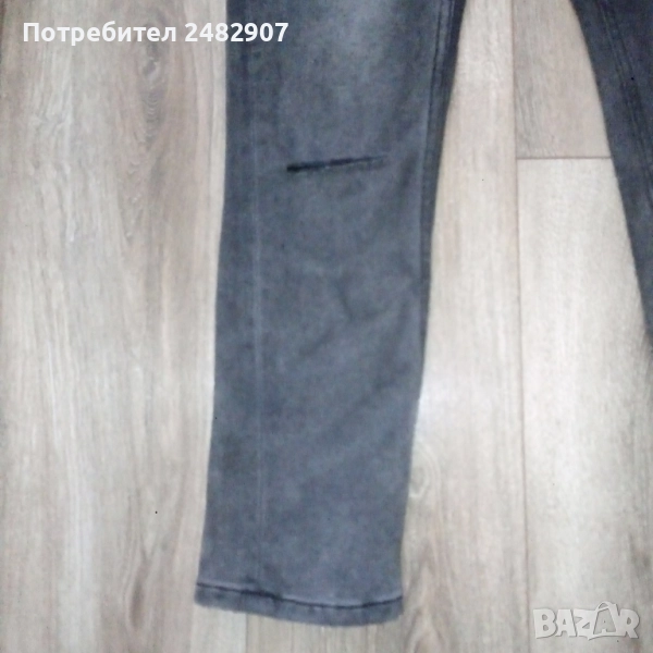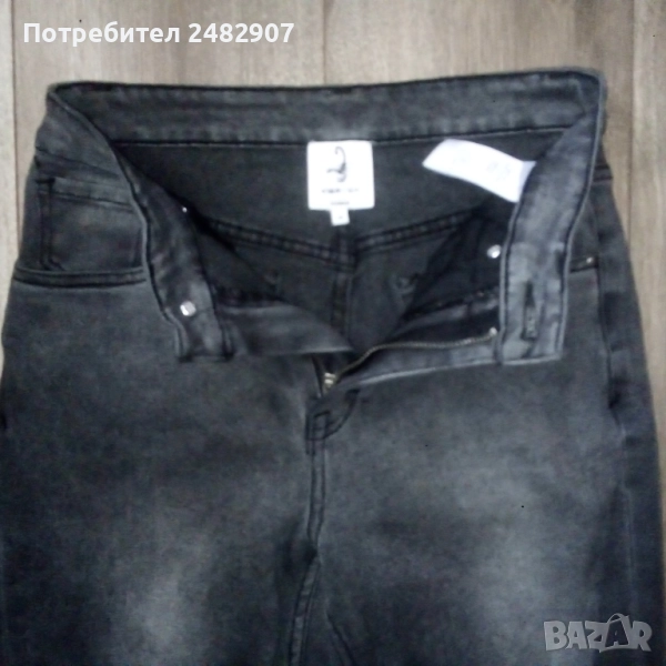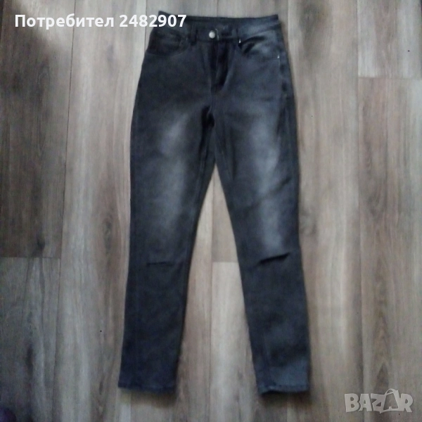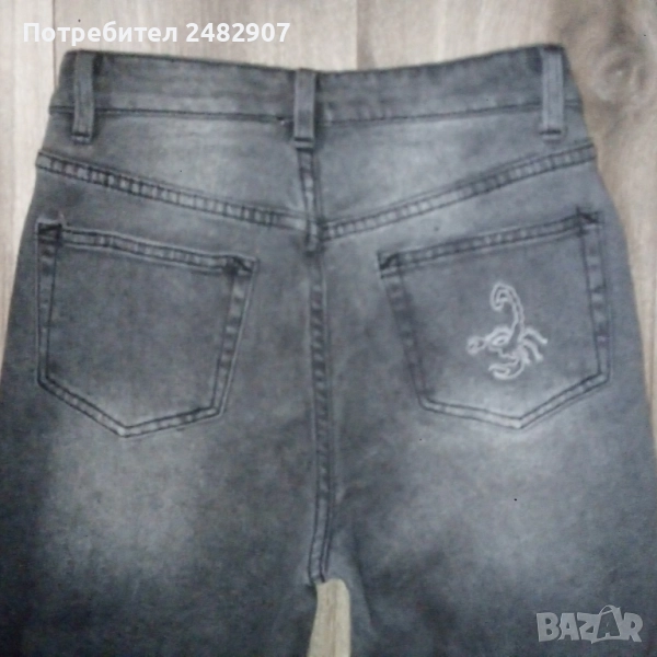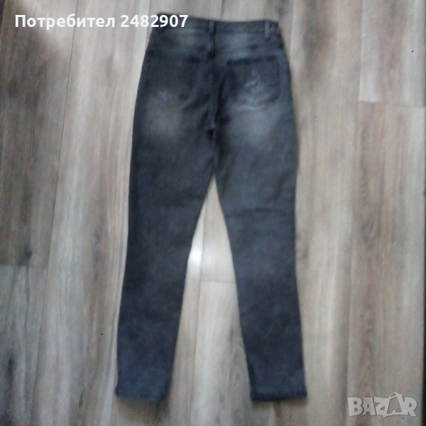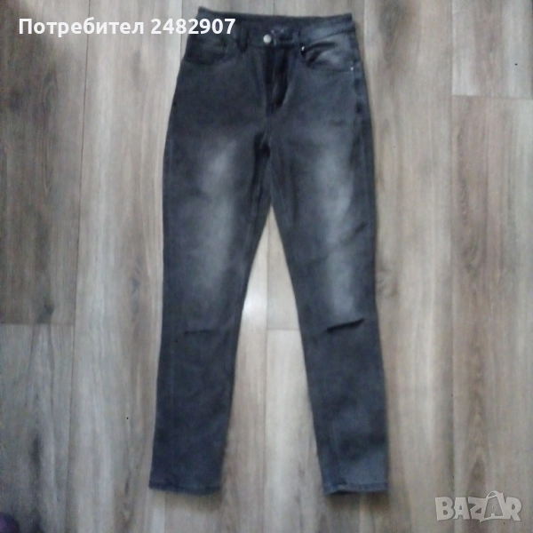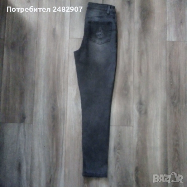 Сиво-черни дамски дънки, размер 36. Съдържат 68 % памук, 31 % полиестер и 1 % еластан. Ширина в талията - 33 см, дължина от талията до чатала - 26 см, дължина от талията до долу - 100 см, ширина на крачола в долната част - 14 см. Много запазени, почти не са използвани.