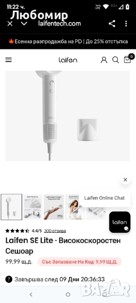 Сешоар Laifen SE Lite, сешоар с отрицателни йони и безчетков мотор със 100 000 оборота в минута