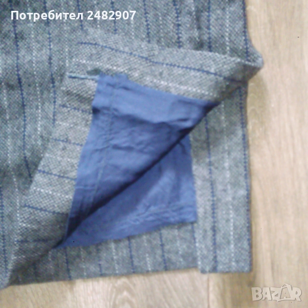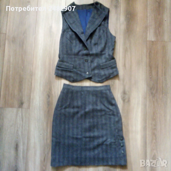 Елегантен сив дамски костюм от фин вълнен плат и подплата, размер S.