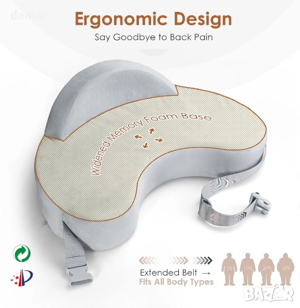 Тази възглавница за кърмене е изработена от първокласна мемори пяна за твърда, но омекотена опора, която спомага за поддържането на идеалната височина за лесно засмукване, като същевременно намалява напрежението върху ръцете, врата и гърба. Изключително големият ѝ дизайн (56×36×20 см) предлага достатъчно пространство за растящи бебета и допълнителен комфорт по време на продължително хранене. Регулируемата презрамка за кръста осигурява сигурно и стабилно прилягане, като държи възглавницата на място за безопасно и постоянно позициониране. Свалящият се, дишащ калъф е нежен към бебешката кожа и може да се пере в пералня, с прахоустойчива подплата, защитаваща сърцевината. Идеална за кърмене или хранене с шише, тя е практичен и услужлив подарък за нови родители.