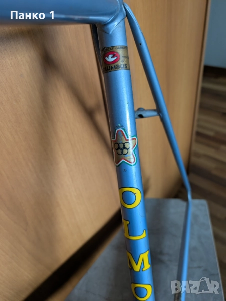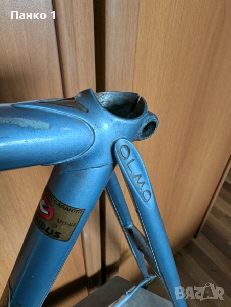 Фреймсета е от края на 70те, топ модела на Италианската марка Олмо, Competition модела направен от Columbus SL тръби и с много красиви хромирани муфи в размер 56ти, измерена от центъра на средното до края на седалковата тръба и 54см хоризонтална тръба измерена център-център. Боята е оригинлна, като в голяма част е в много хубаво състояние, с изключение на чейнстей, където се вижда от снимкте че има забележки, по фреймсета няма никакви вдлъбнатини или ремонти. Фреймсета е с уши Campagnolo, задното разтояние е 126мм , седалковата тръба е за 27.2мм колче, средното Италиански стандарт. Рамката тежи малко под 1890 грама, вилката около 660 грама.