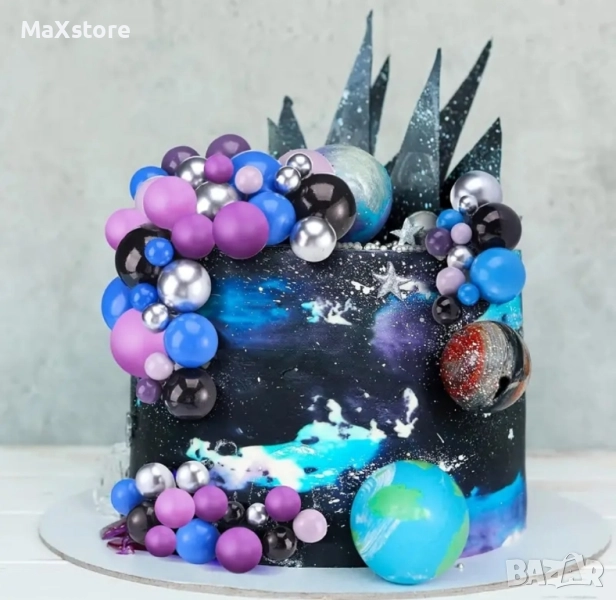 108 броя топчета на тел от стиропор за декорация на торта в лилав, син, черен и сребрист цвят.
