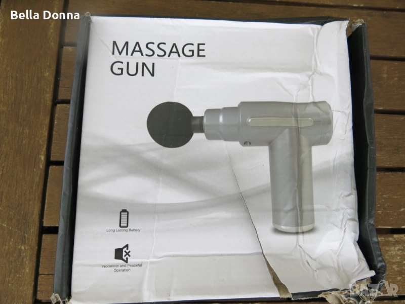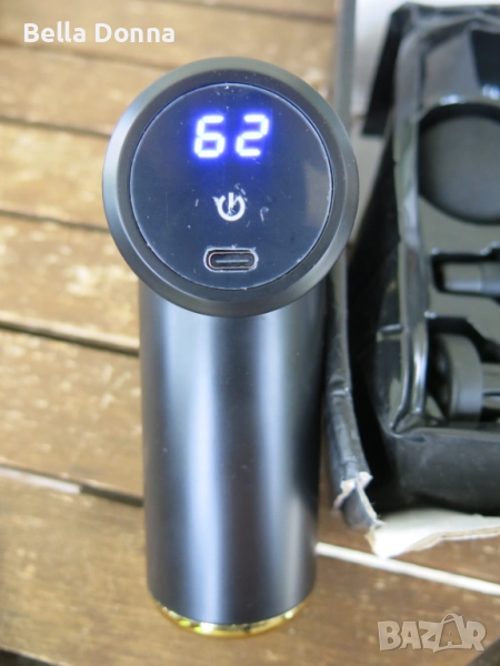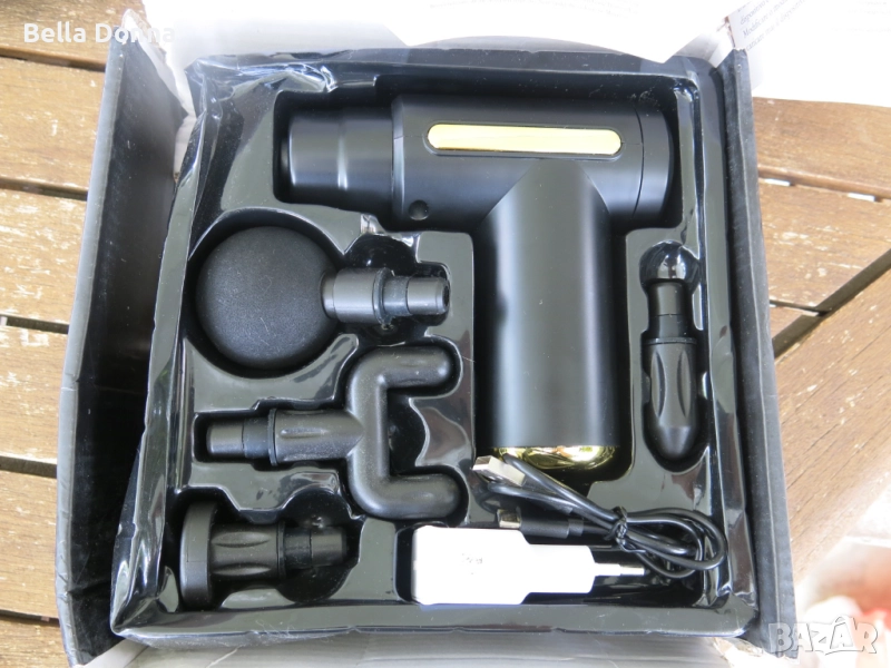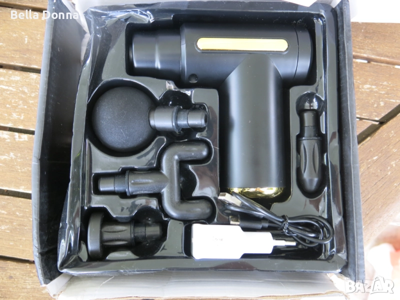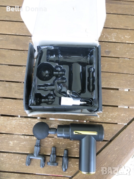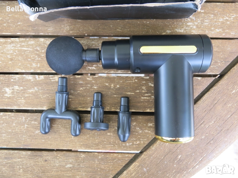 Масажен пистолет, вибрационен с 4 приставки и 6 степени. Нов, не е използван, но има забележки по кутията.