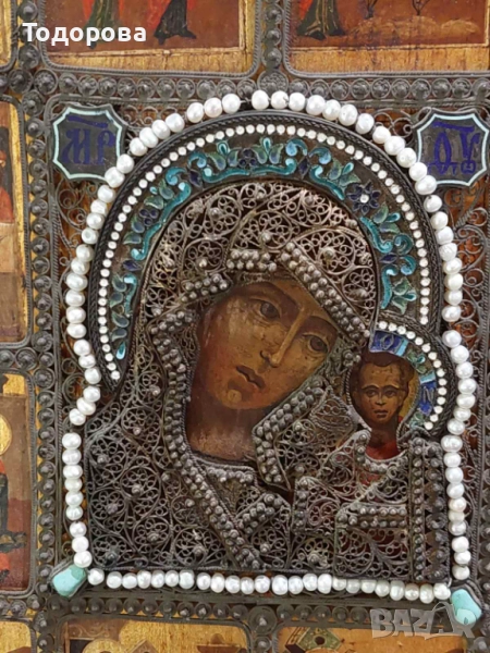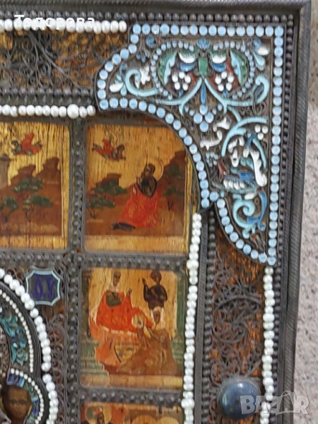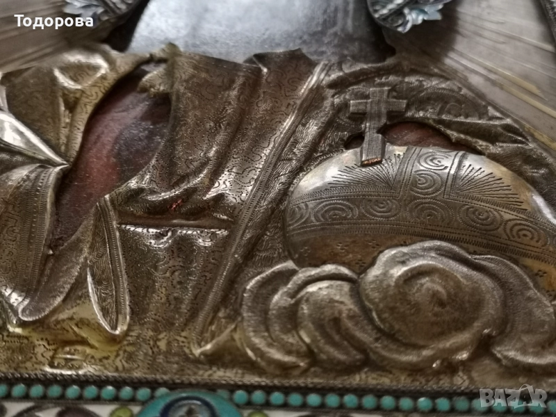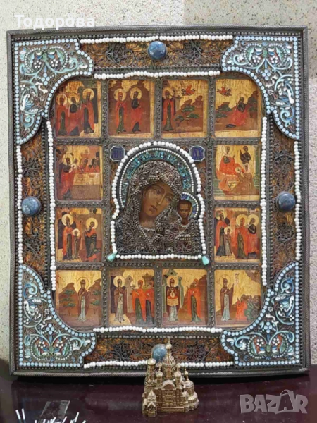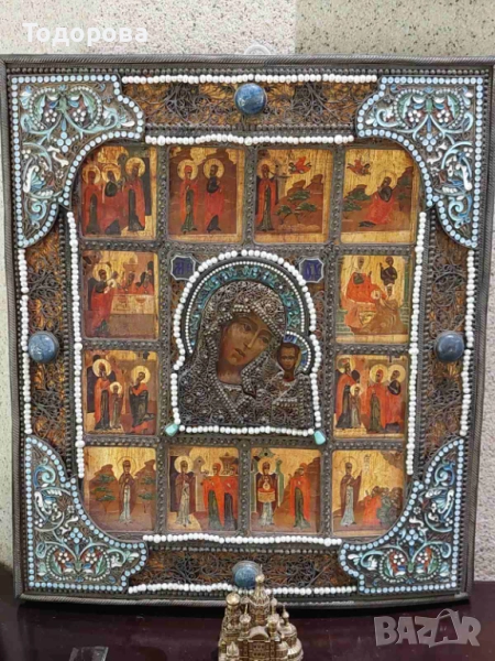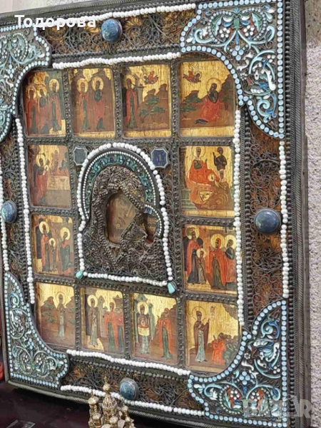 Поради новата политика на базар бг. се налага да правя лотове на обявите ми.Всеки който иска повече информация за даден артикул ще му бъде предоставена на вайбър след като се свърже с мен.Благодаря Ви предварително за разбирането!Показвам една Руска сребърна 84, икона с клетъчен емайл!!Размерът на основната икона е 20.5/17.5 смПроизведена 19 век 1858 г.Има и други подобни поставени,за тях повече информация и снимки на посочения телефон;0897840737 Цените на даден предмет се определят от следните фактори; моментна цена на материала на международните борси’’което не толкова от голямо значение. Антикварната стойност на предмета и неговото състояние,време на производство, и името на фирма, или майстор сътворил такава красота.