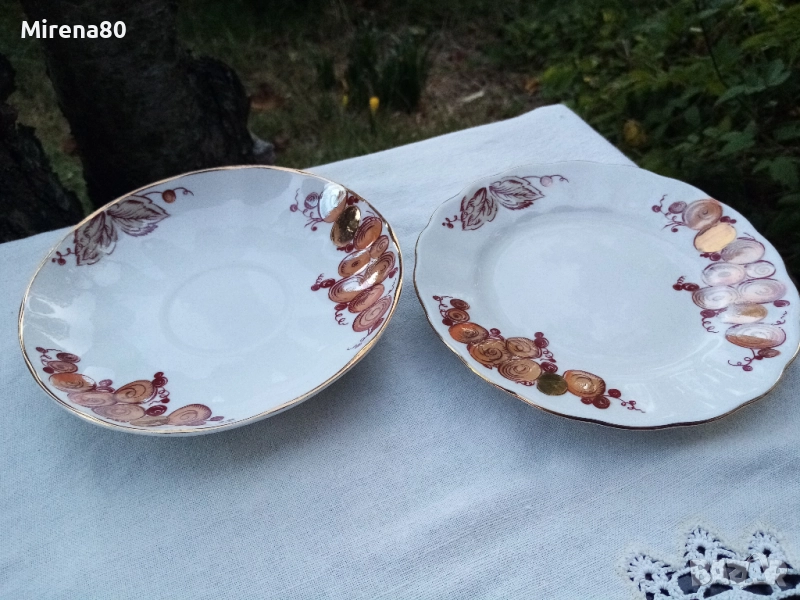 СССР, много подходящ за предстоящата златна есен. Производител - ЛФЗ, автор на декора - С.Е. Яковлева, художник - С.П. Богданова. Фин твърд порцелан, чашите са във формата на лале, ръчен рисунък с 24 к истинско злато. Един истински оранжево-кафяво-златен есенен разкош ! Маркировка на всички 22 части.