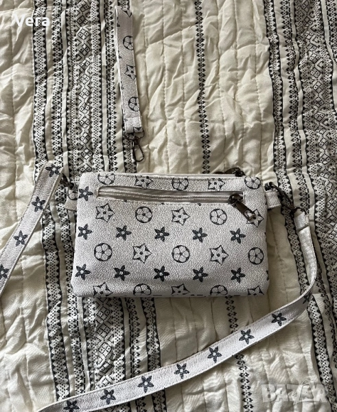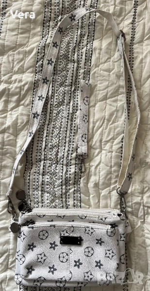 Малка дамска кожена чанта с много разделения. Разполага с дълга и с къса дръжка. Няма забележки.