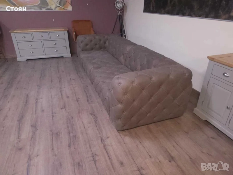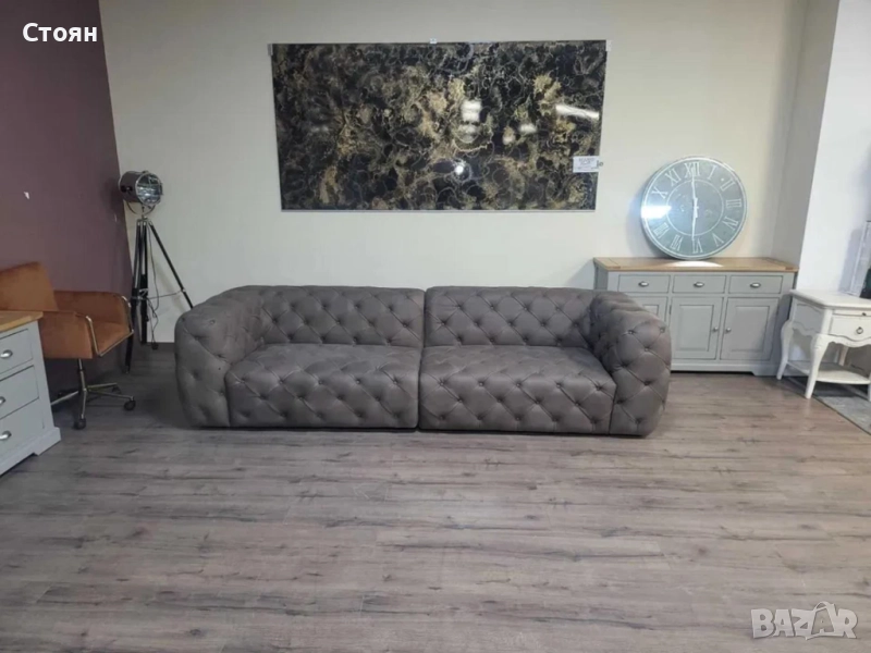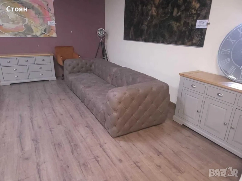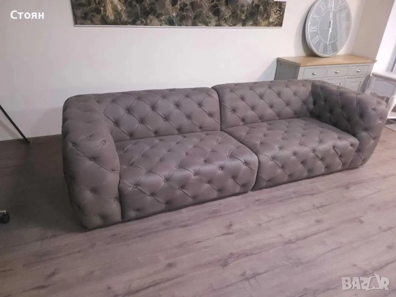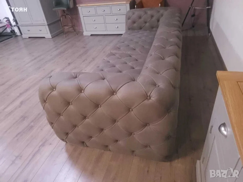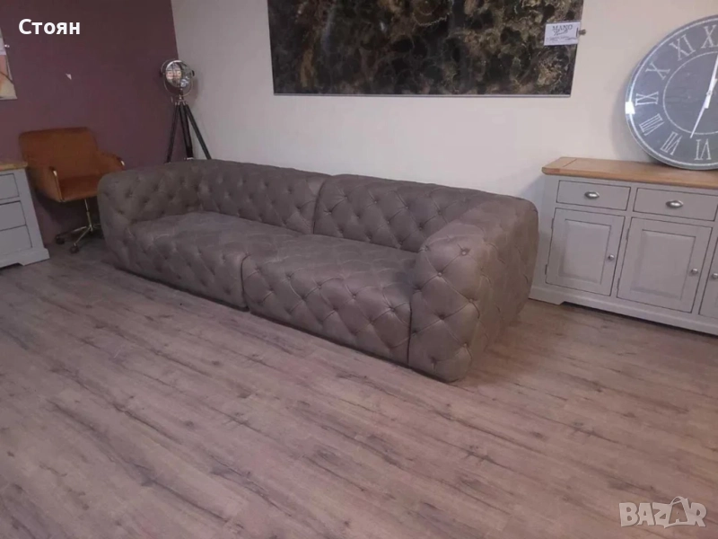 Дизайнерски кафяв кожен диван четворка Честърфийлд