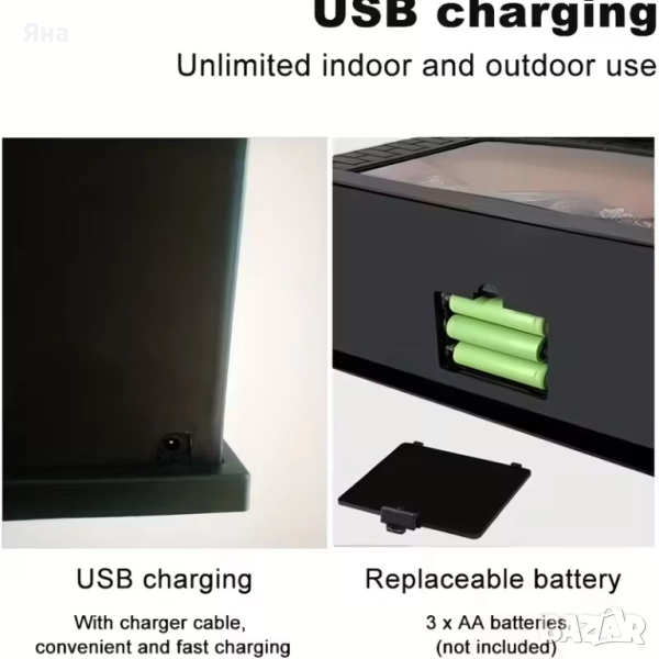 Декорацията за камина с ефект на пламък включва 3 LED източника, с топла светлина и работи с 3 AA батерии (закупуват се отделно) или може да се захранва от USB.