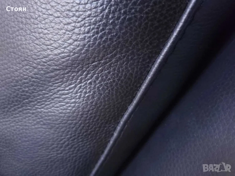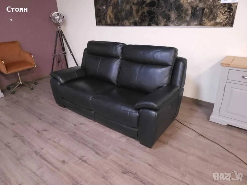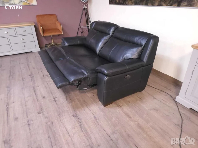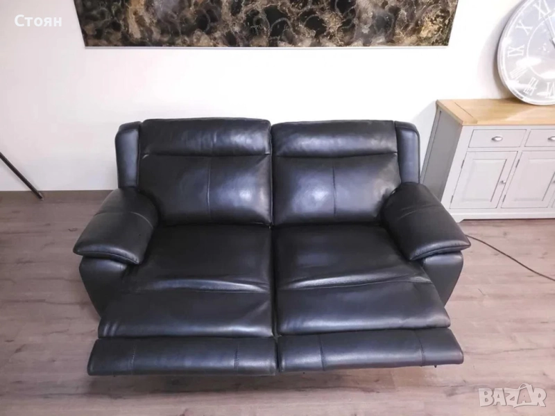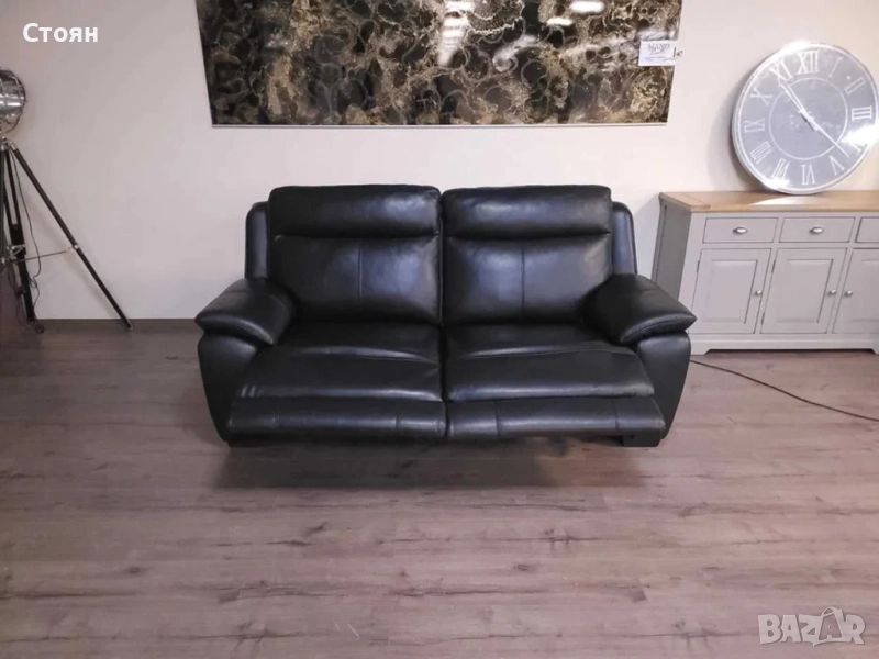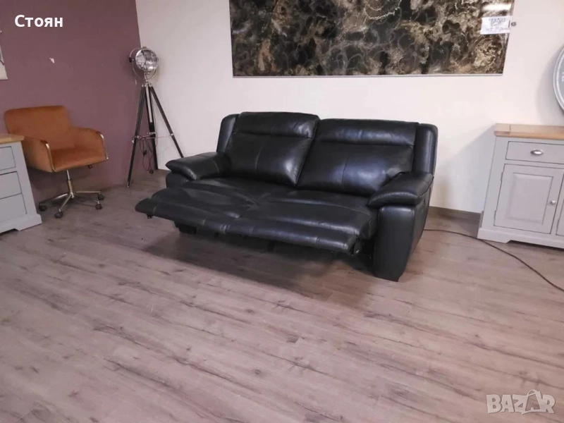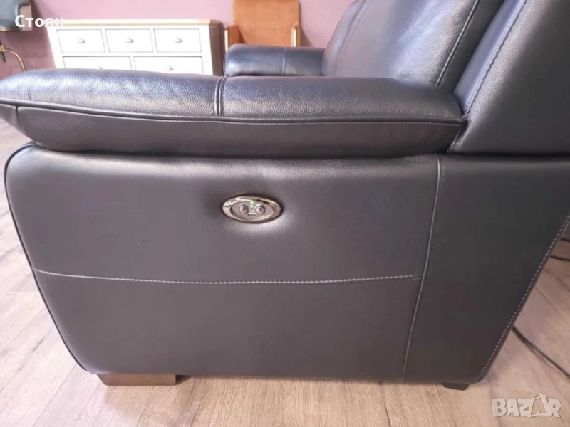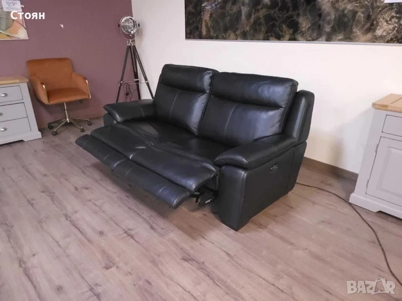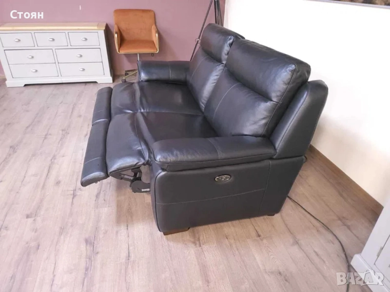 Черен кожен диван тройка с електрически релаксиращ механизъм за краката.
