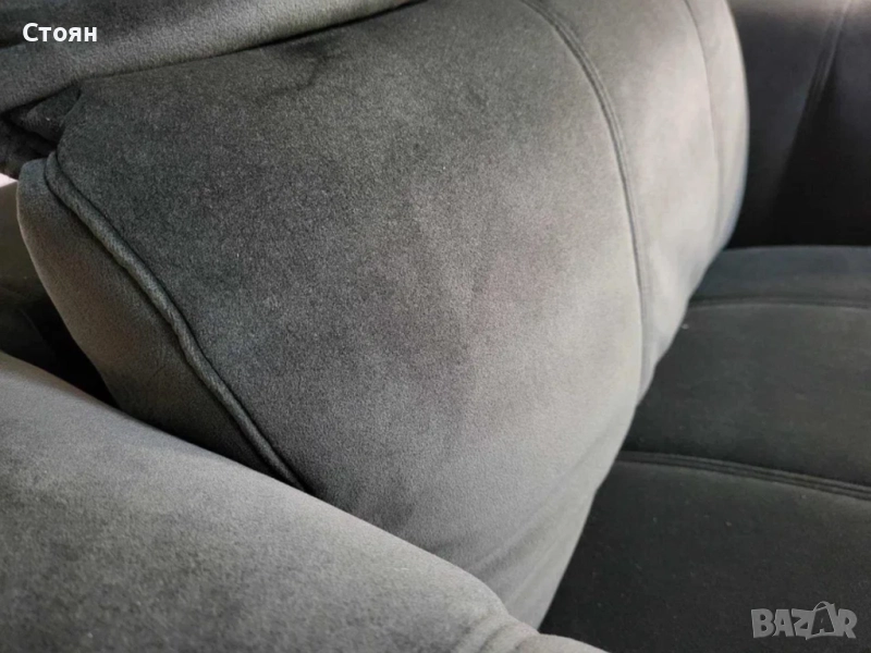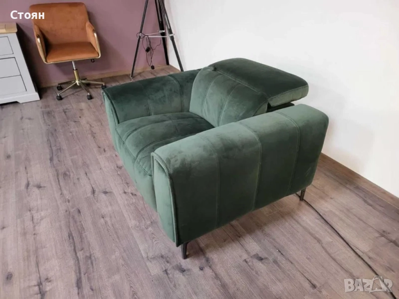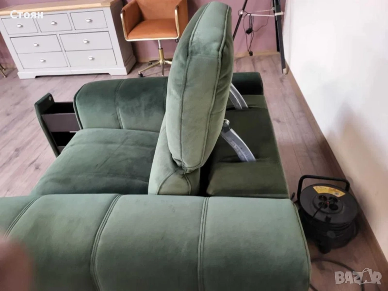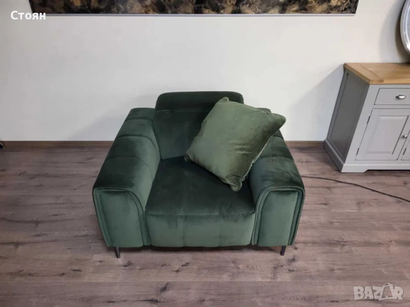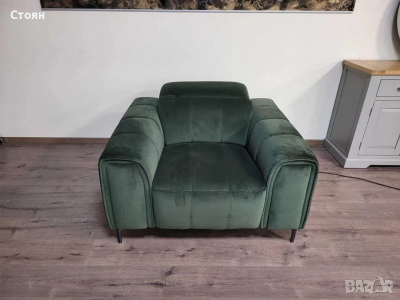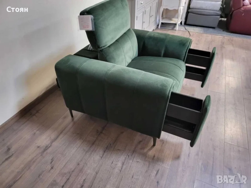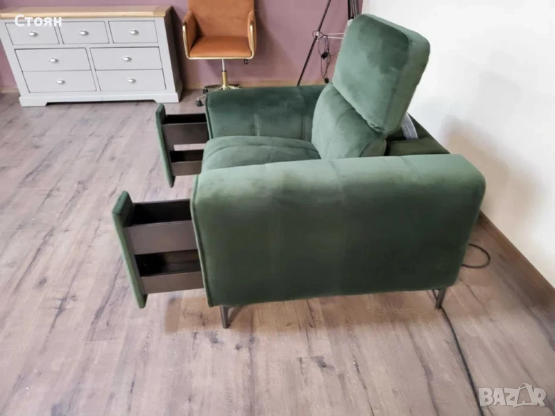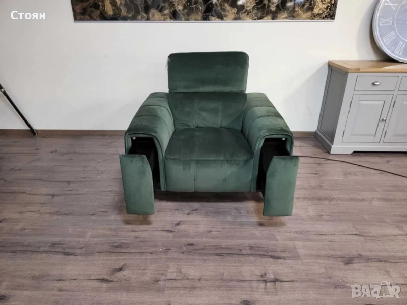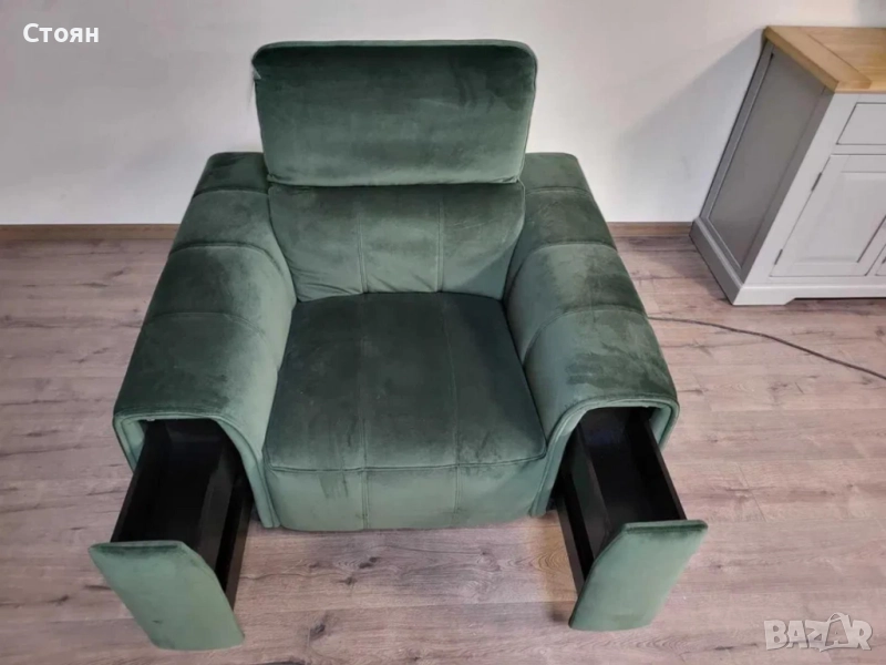 Зелен фотьойл от плат с електрически релаксиращ механизъм за краката и подвижни облегалки. Има чекмеджета на двата подлакътника.