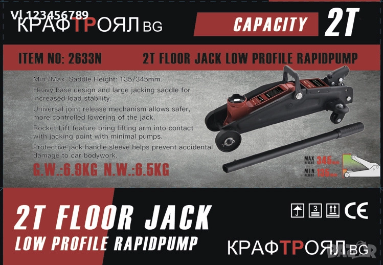 нископрофилен крик 2 тона KraftRoyal позволява работа във различни минимални - максимални диапазони ( 235 mm. до 345mm.).