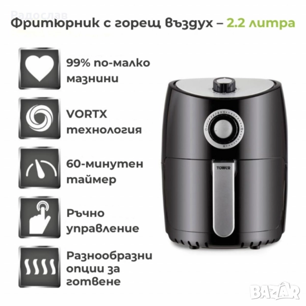 Модел: Tower VORTX 2.2 L Air Fryer; Капацитет: 2.2 литра; Мощност: 1000 W; Технология: VORTX – бърза циркулация на въздуха; Готвене: пържене, печене, гриловане, запичане; Таймер: до 30 минути; Регулиране на температурата: до 200°C; Управление: механично, въртящи се копчета; Кошница: с незалепващо покритие, лесна за почистване; Безопасност: противоплъзгащи се крачета;