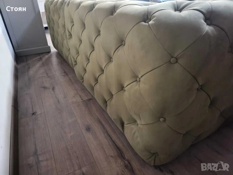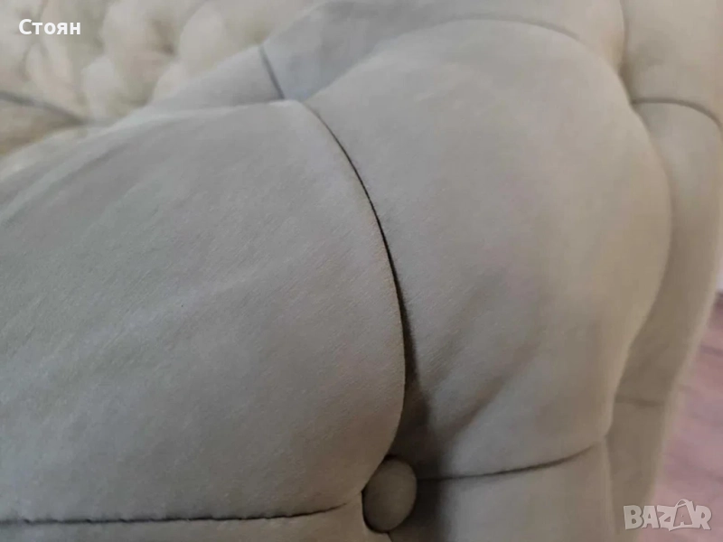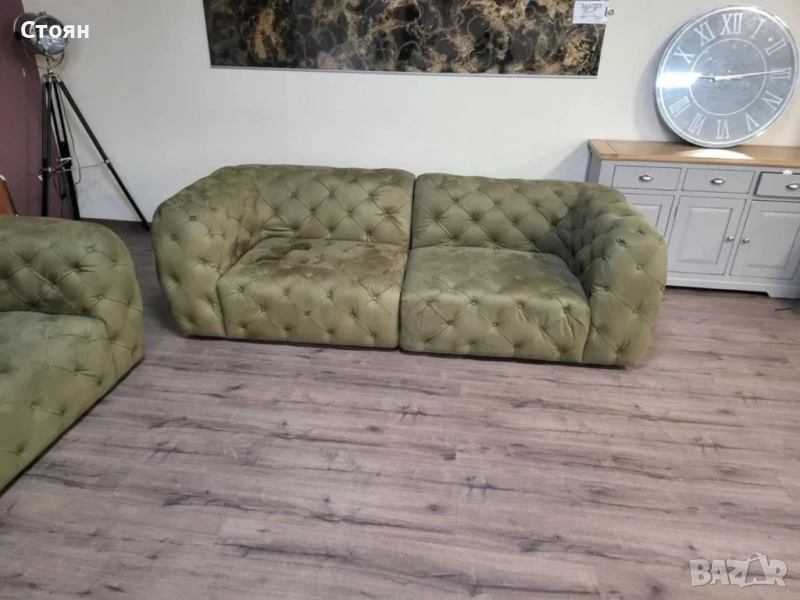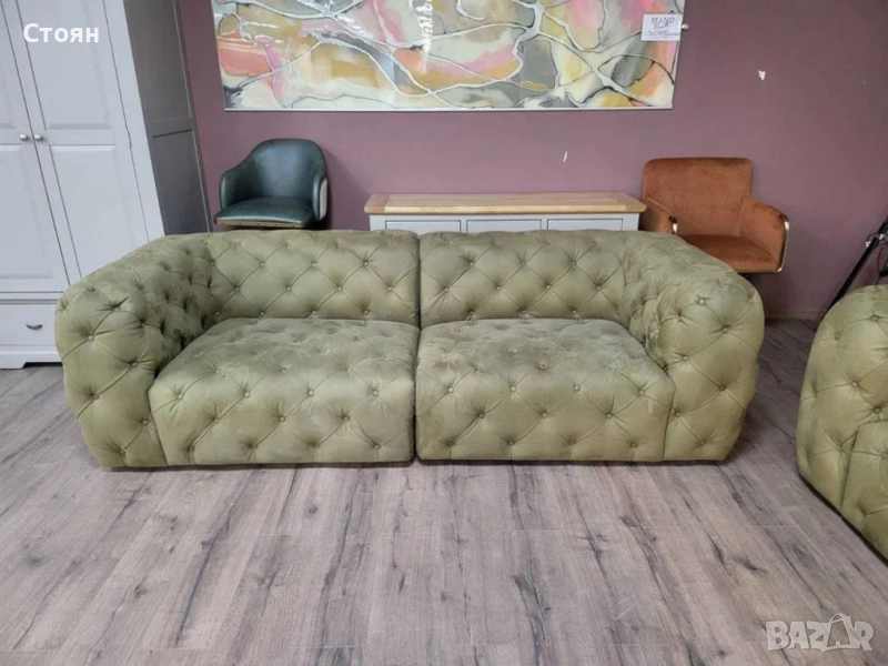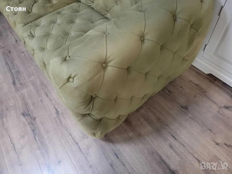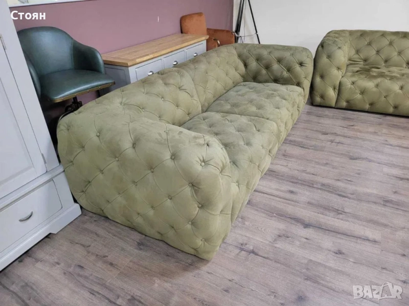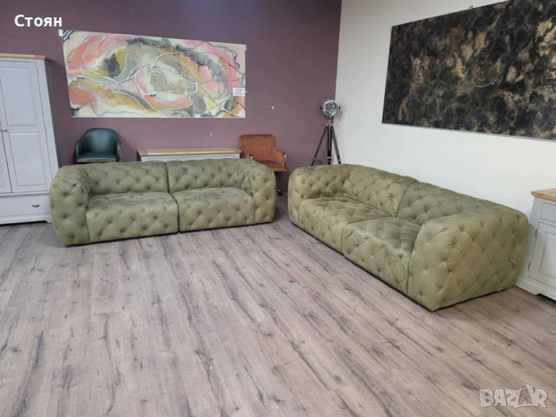 Зелен комплект дивани от плат набук две тройки тип Честърфийлд - 2 комплекта налични!
