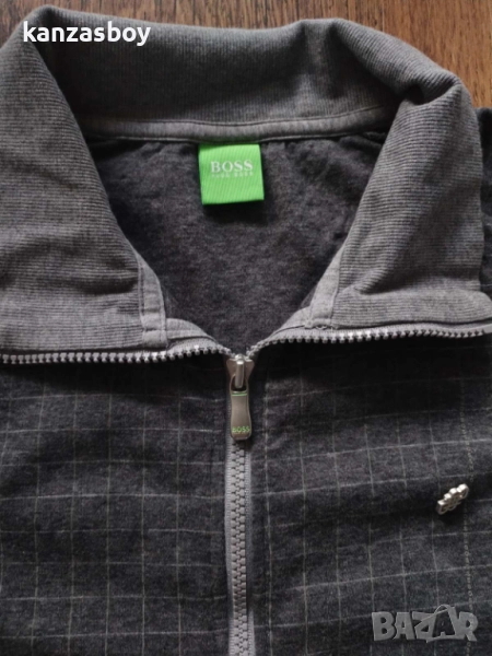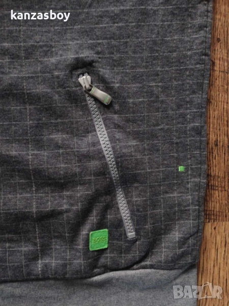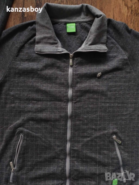 HUGO BOSS Skazz 2 - страхотно мъжко горнище р-р L, точни размери: ширина подмишници - 55см, дължина - 64см, дължина на ръкава - 66см, цялостното състояние е отлично, множество акценти на марката, има една забележка - тънка избледняла ивица на гърба съобразена с цената и показана на последната снимка