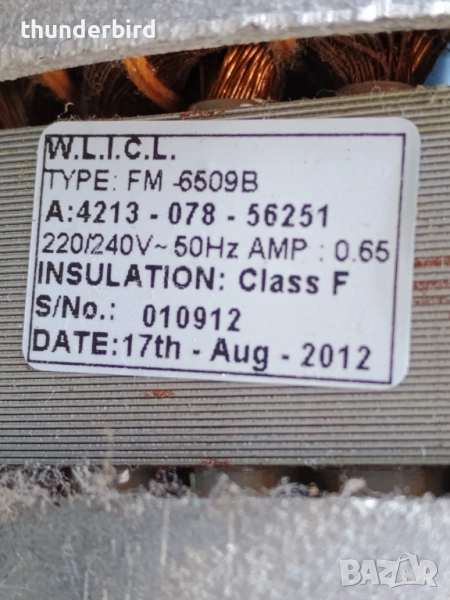 Предлагам монофазен електродвигател модел FM-6509 B с технически параметри: 220/240 V, 50 Hz, 0.65 A, изолационен клас F. Подходящ за сушилни, шмиргел и т.н.