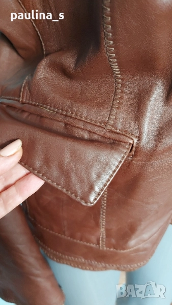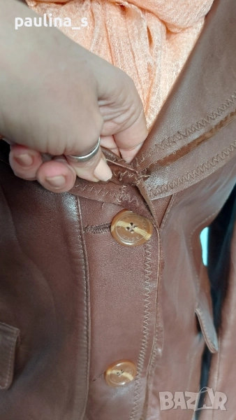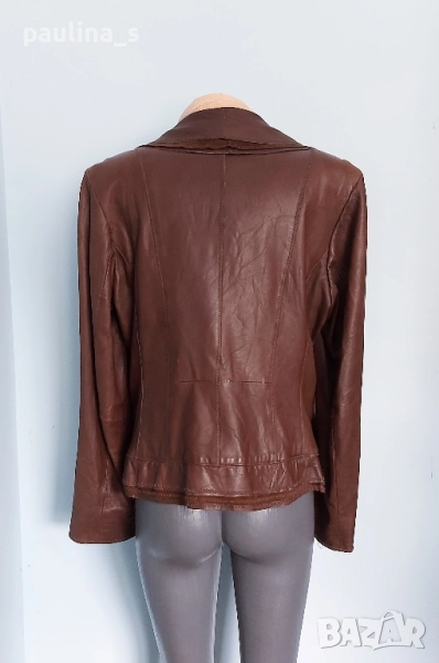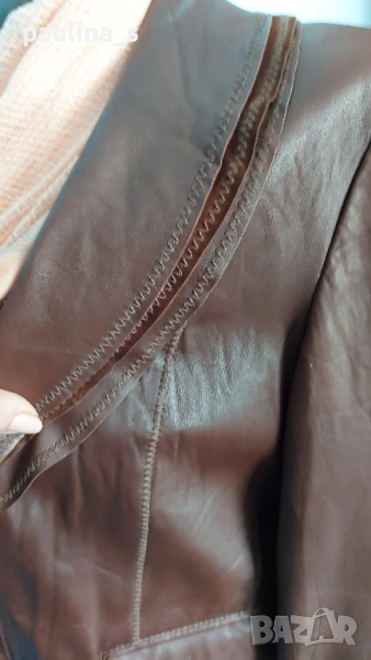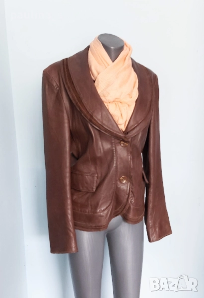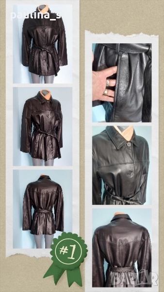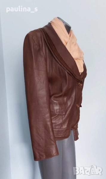 1️⃣. Колаж L / XL - "Arma" collection. Цената е крайна, без пазарлъци 159,99лв / 80 евро. Дамско яке, тип сако с дълбоко деколте и многопластова яка, от естествена агнешка кожа. Моделът е втален, дрехата е изумителна и много впечатлителна. Цветът е класически кафяв за кожа. Ръкавите, декорациите и модела са подчертани със зиг-заг тегели, на яката има пласт от обратната страна. Не е чисто ново, като ново, обличано е два пъти, без дефекти и етикет. Голям размер, не стои подобаващо на манекена. Реални цени за бранда над 500 евро.