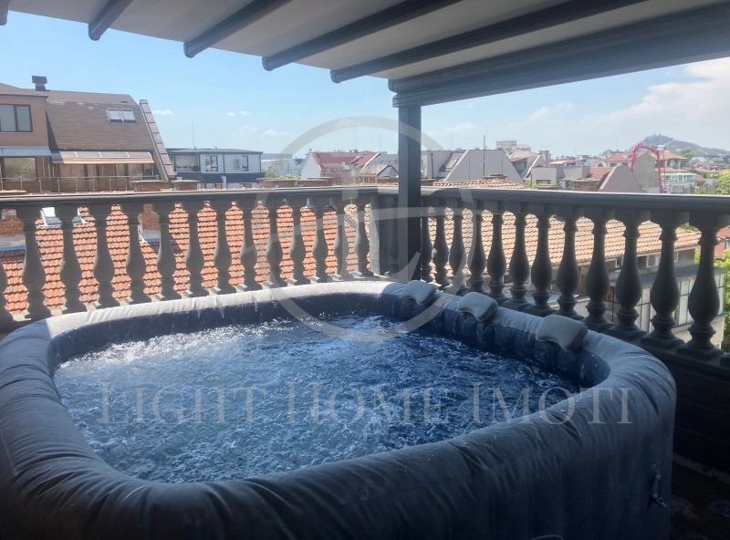 - Разпределение: Първи етаж: Просторна и светла дневна с кухненски бокс, баня с тоалетна и две тераси. Втори етаж: две големи спални, баня с тоалетна и тераса. Трети етаж: две просторни спални и уникална панорамна тераса с гледка към града, тента и джакузи.