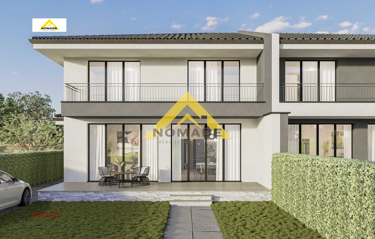 Агенция Номад предлагаме за продажба уютни къщи близнаци, всяка със самостоятелен вход, двор и отделен външен гараж