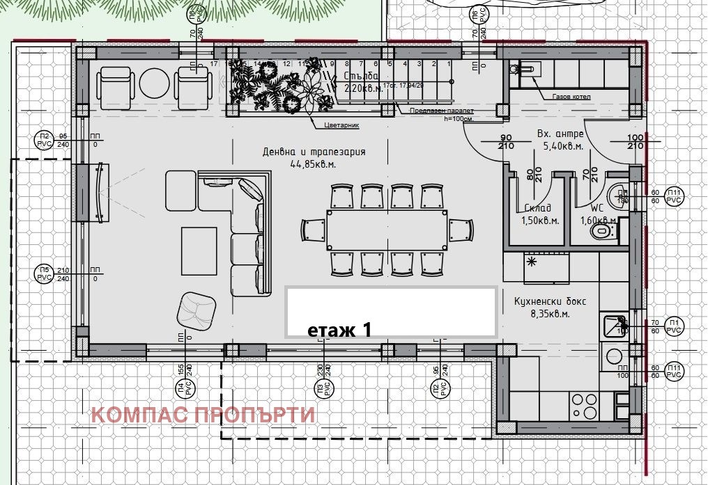 Площ: къщата е с РЗП: 170м2, дворът с площ от 494 м2.