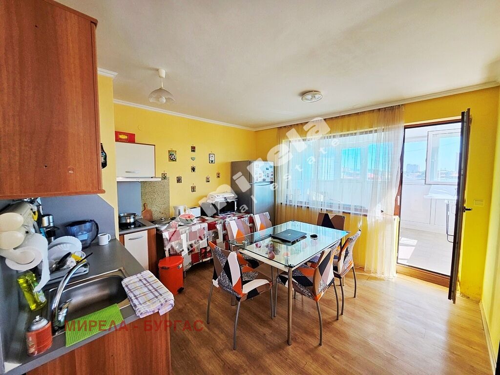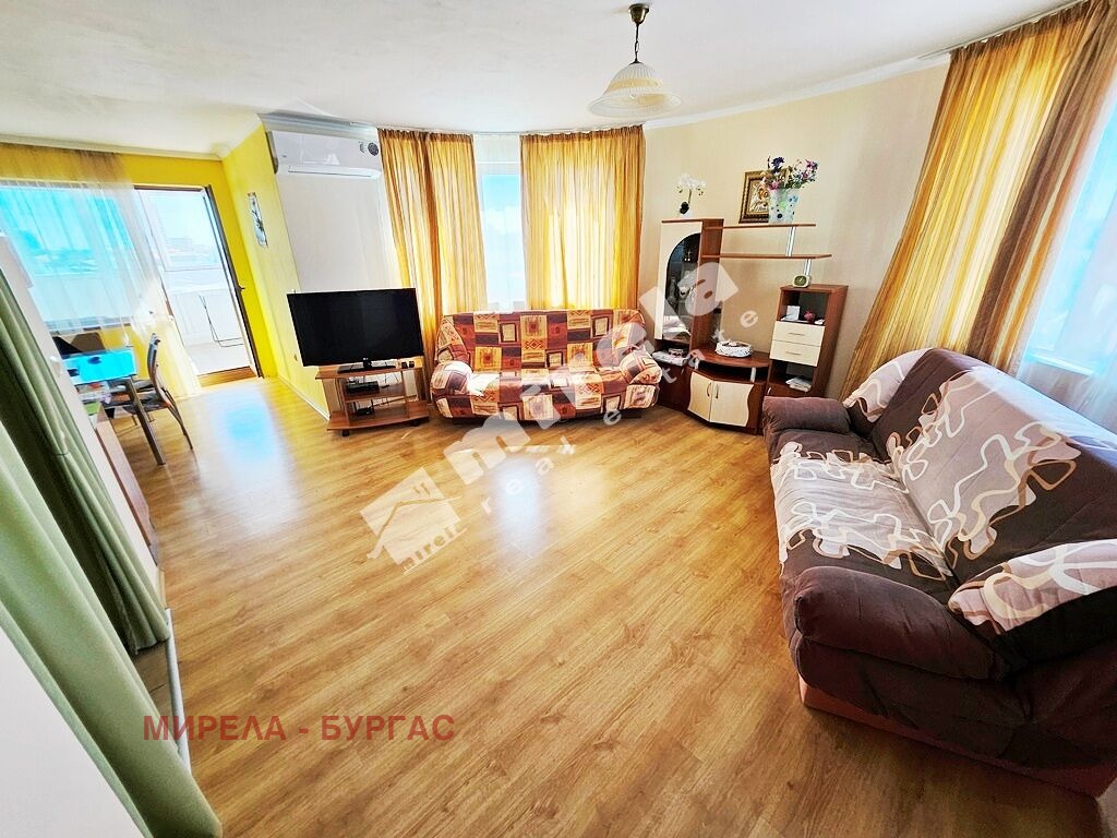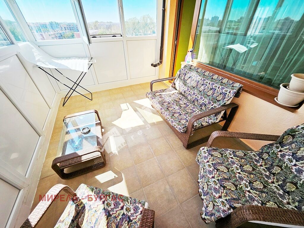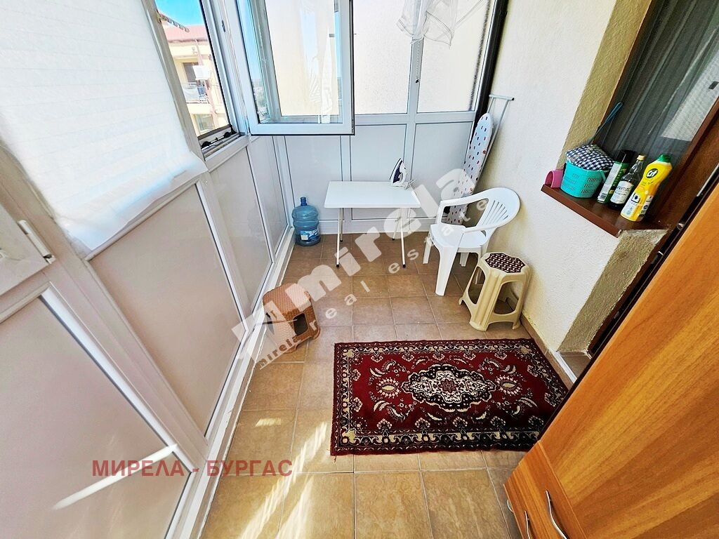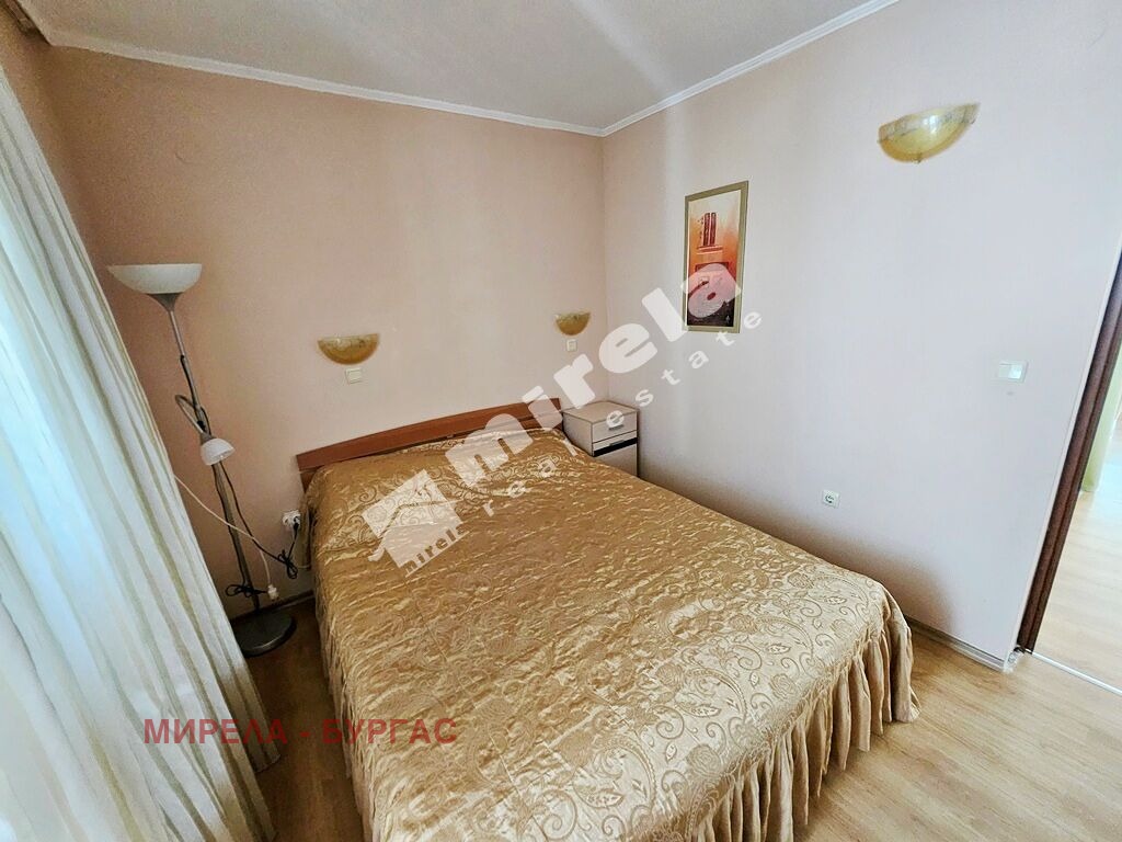 Апартаментът се намира на седми жилищен етаж и е с две изложения и има гледка към басейна, и към. Не се нуждае ремонт. Има следното разпределение- просторна всекидневна с кухненска част, спалня, санитарен възел, две остъклени тераси. Може да се живее целогодишно или евентуално да се отдава за лятото под наем.
