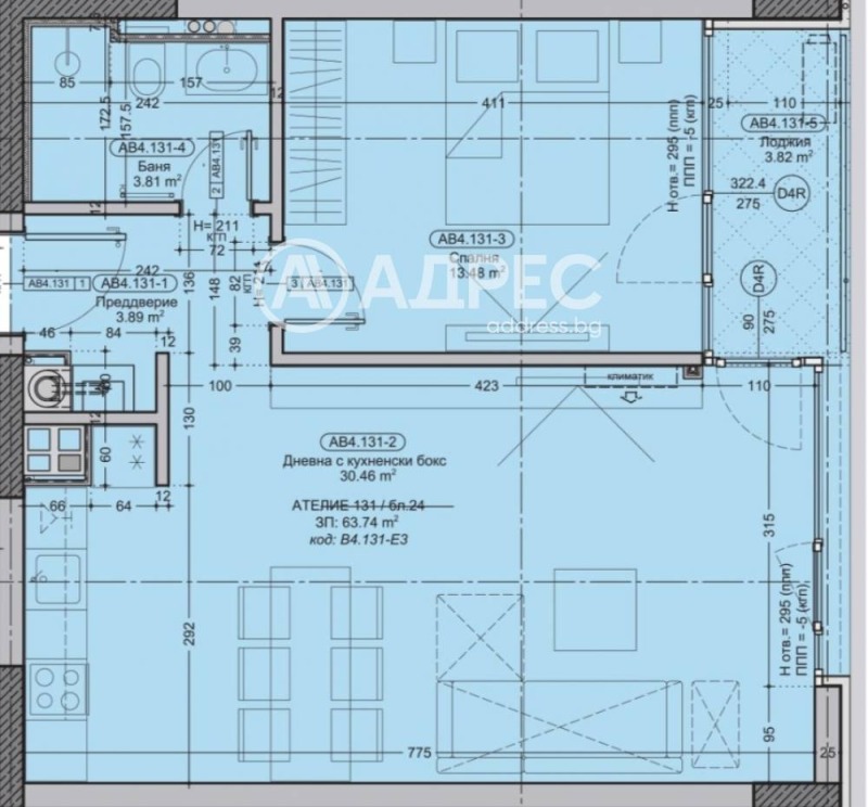 Апартаментът е със стаут на ателие и се намира на 3-ти етаж, с изложение запад/север и има обща площ 76.34 кв.м. Състои се от антре, баня/тоалетна, всекидневна с кухня, една спалня, тераса тип лоджия, с излаз от двете стаи.