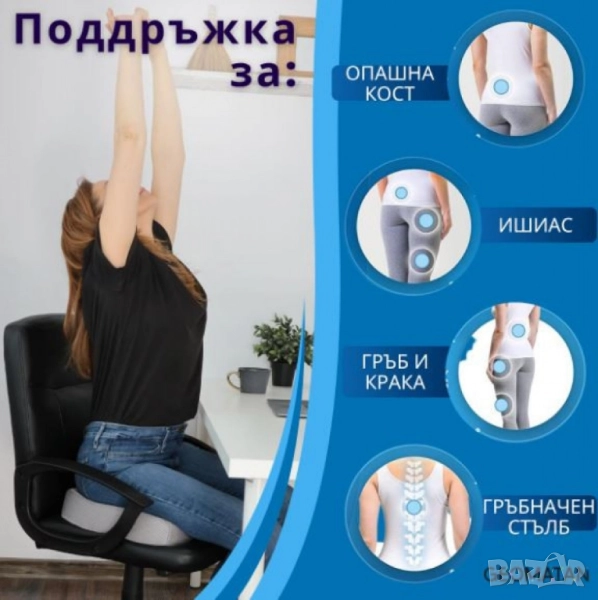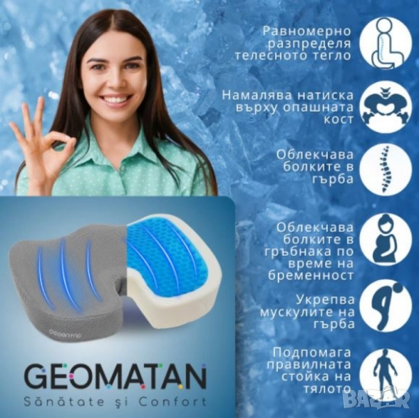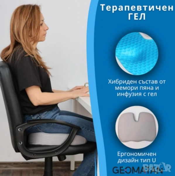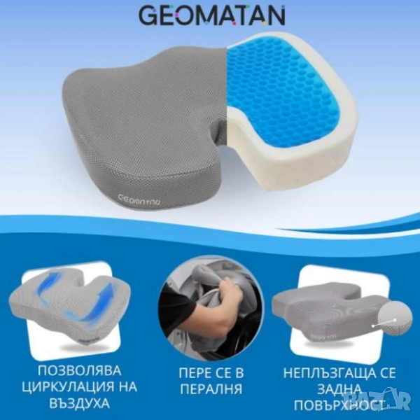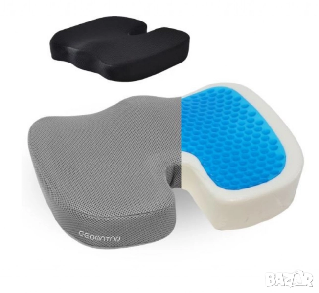 Тип: възглавница за седене, ергономична U-форма (tailbone/coccyx relief); Състав на ядрото: мемори пяна с повърхностен гел слой за охлаждащ ефект; Калъф: мек soft-fleece / дишащ текстил, свалящ се със цип, подходящ за машинно пране; Долна страна: анти-слип точки против приплъзване; Препоръчително натоварване: до 120 кг; Приложение: офис стол, домашен стол, автомобил, самолет, инвалидна количка; Ефект при употреба: подпомага правилната стойка, разпределя равномерно тежестта, намалява натиска върху опашната кост и лумбалната зона; Поддръжка: сваляне и пране на калъфа при 30 °C; вентилиране на пяната, без машинно пране/сушене на ядрото; Опаковка/маркировки по серията: “Gel + Memory Foam”, anti-slip base, washable cover;