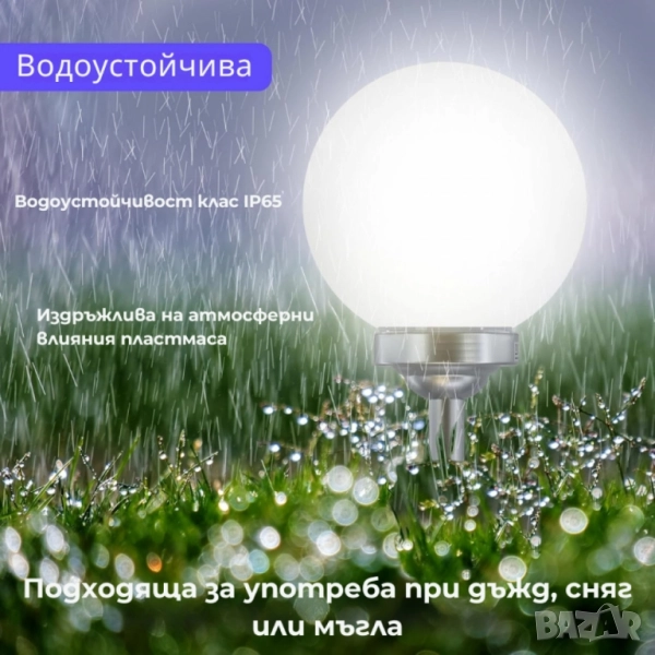 Тип: LED соларна градинска лампа на колче (сфера); Диаметър на сферата: Ø 30 см; Захранване: вграден соларен панел + акумулатор AA Ni-MH (включен); Режим на работа: автоматично включване по тъмно / изключване по светло (вграден сензор); Управление: превключвател ON/OFF (под капака – активирайте при първа употреба); Светлина: мека бяла, дифузна (360° разпределение); Препоръчително разположение: на открито слънчево място; избягвайте сянка от дървета и близост до улични лампи, които могат да „заблуждават“ сензора; Степен на защита: IP65 – за външна употреба, защитена от пръски вода; Монтаж: секционно стебло + назъбен земен шип (без инструменти); Сертификация: CE; Поддръжка: периодично почистване на соларния панел; при нужда подмяна на AA Ni-MH акумулатор;