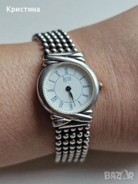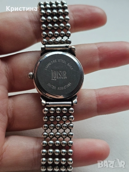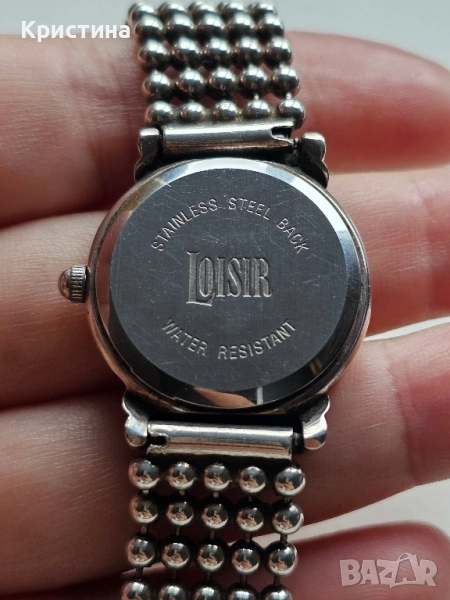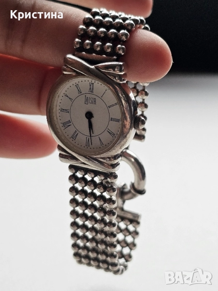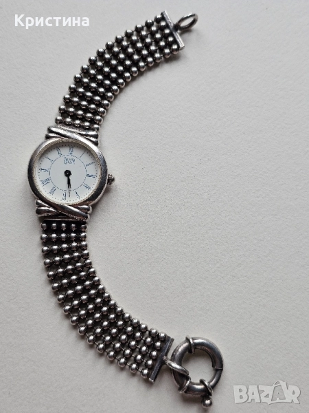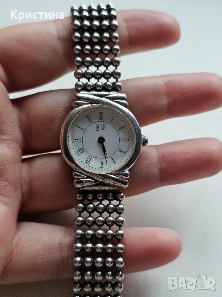 Марков сребърен часовник на Loisir by Oxette. Кварцов (с батерия). Проба: 925 (немаркиран, тестван). Само капачето на гърба е от неръждаема стомана. Тегло: 39 гр. Дължина: 18 см. Цена: 320 лв./164 €. Часовника работи отлично, но батерията му е за смяна.