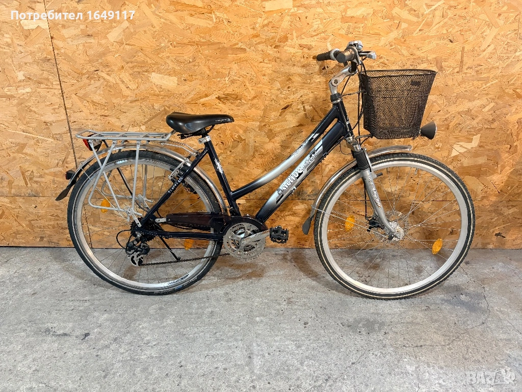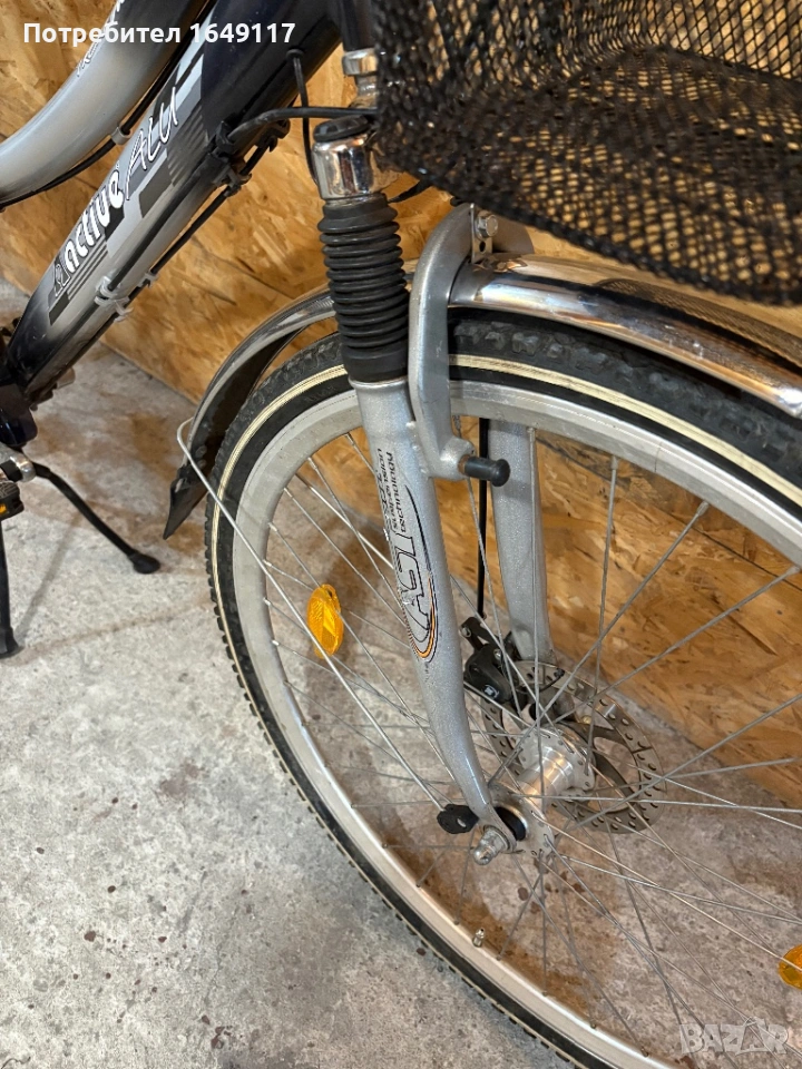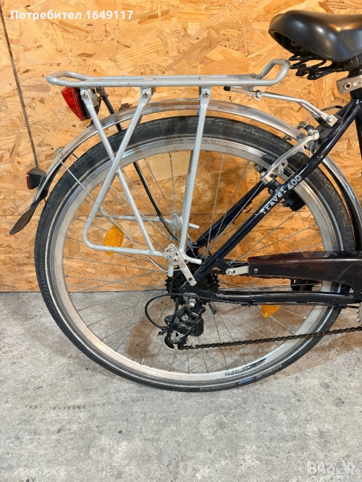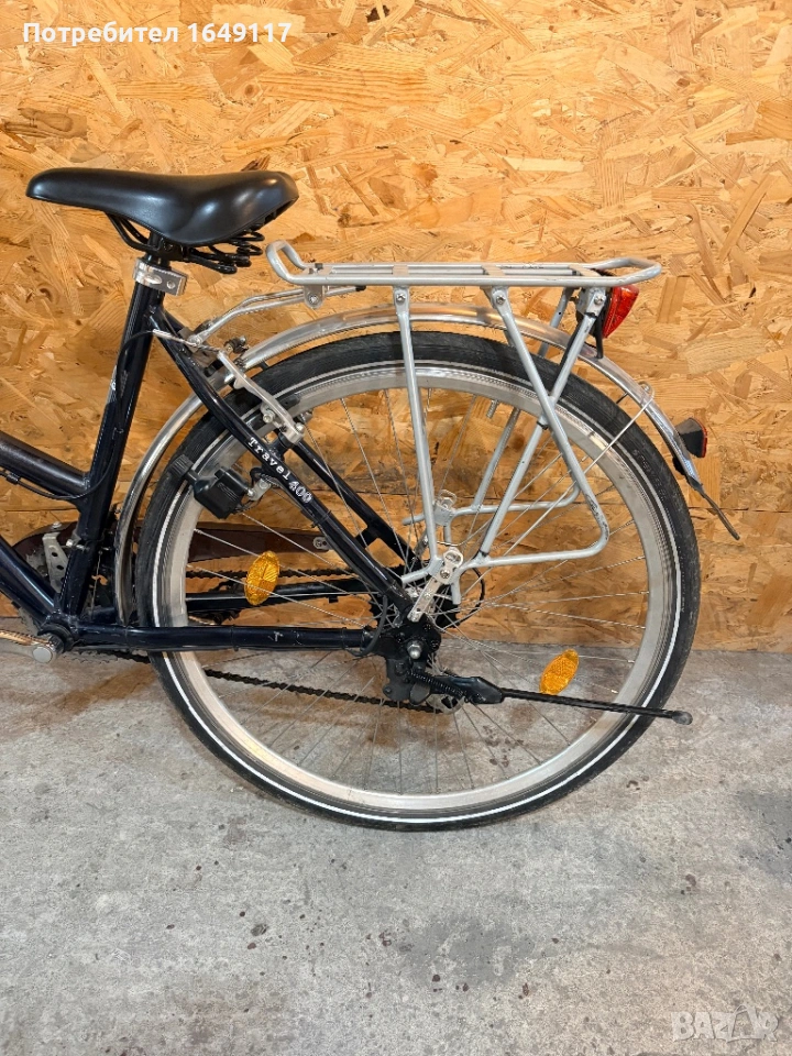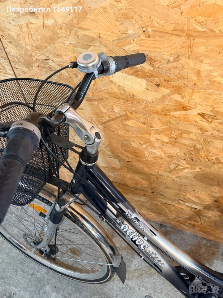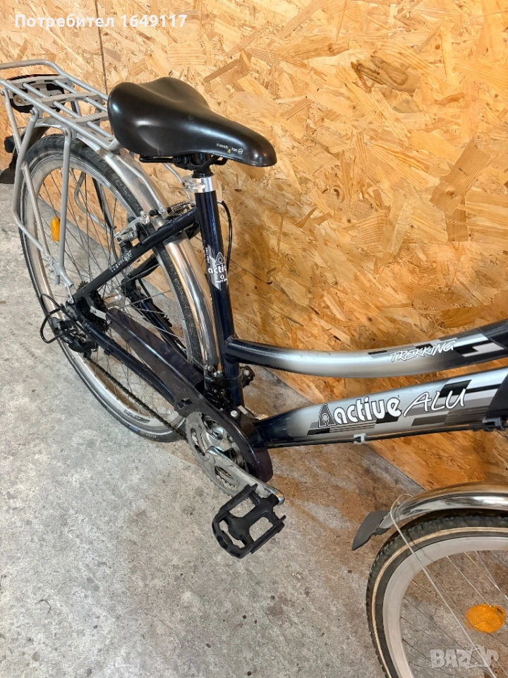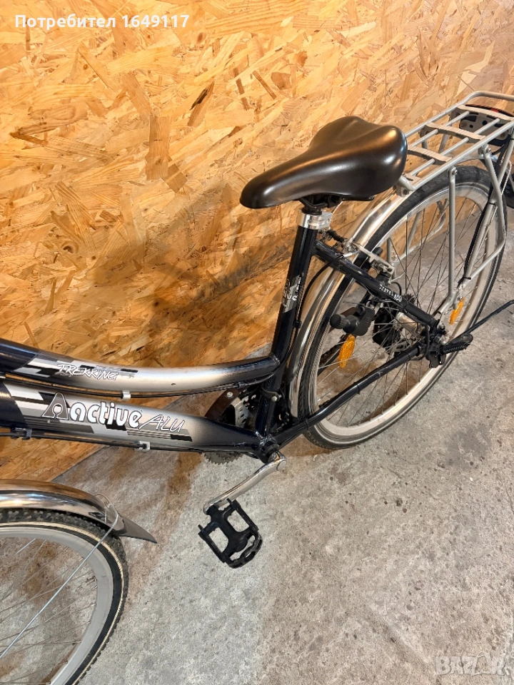 Продавам 28цола, малко употребяван, дамски-градски велосипед Active ALU Trekking Travel400[made in Germany]. Олекотена, алуминиева рамка - 48см. Външни скорости Shimano Acera - 24бр. c revo shift команди SRAM Max. Предна амортисьорна вилка AST. Никелирани курбели. Спортна, ергономична седалка. Алуминиеви, двойностенни - аеро капли Euro line, и гуми с усилен профил. Предна дискова спирачка + задна алуминиева V-break спирачка. Кормило с алуминиева-раздвижна лапа. Заден алуминиев багажник с натоварване до 25кг + кошница за багаж отпред. Никелирани калници, стойка, динамо с халогенен фар и габаритна светлина, светлоотразители, звънец.
