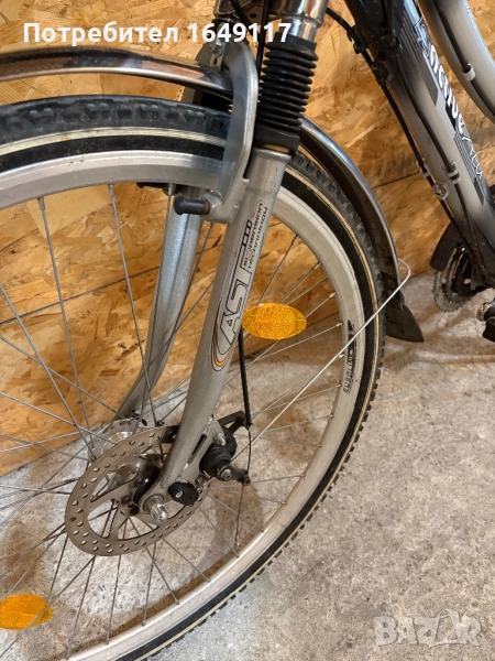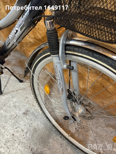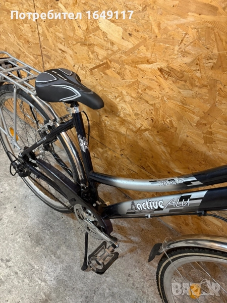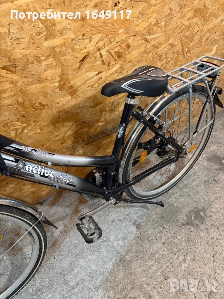 Продавам 28цола, малко употребяван, дамски-градски велосипед Active ALU Trekking Travel400[made in Germany]. Олекотена, алуминиева рамка - 48см. Външни скорости Shimano Acera - 24бр. c revo shift команди SRAM Max. Предна амортисьорна вилка AST. Никелирани курбели с алуминиеви педали. Спортна, ергономична седалка. Алуминиеви, двойностенни - аеро капли Euro line, и гуми с усилен профил. Предна дискова спирачка + задна алуминиева V-break спирачка. Кормило с алуминиева-раздвижна лапа. Заден алуминиев багажник с натоварване до 25кг + кошница за багаж отпред. Никелирани калници, двойна мото стойка, динамо с халогенен фар и габаритна светлина, светлоотразители, звънец.