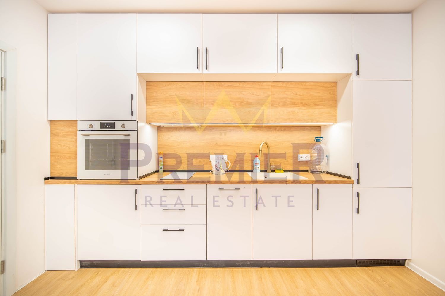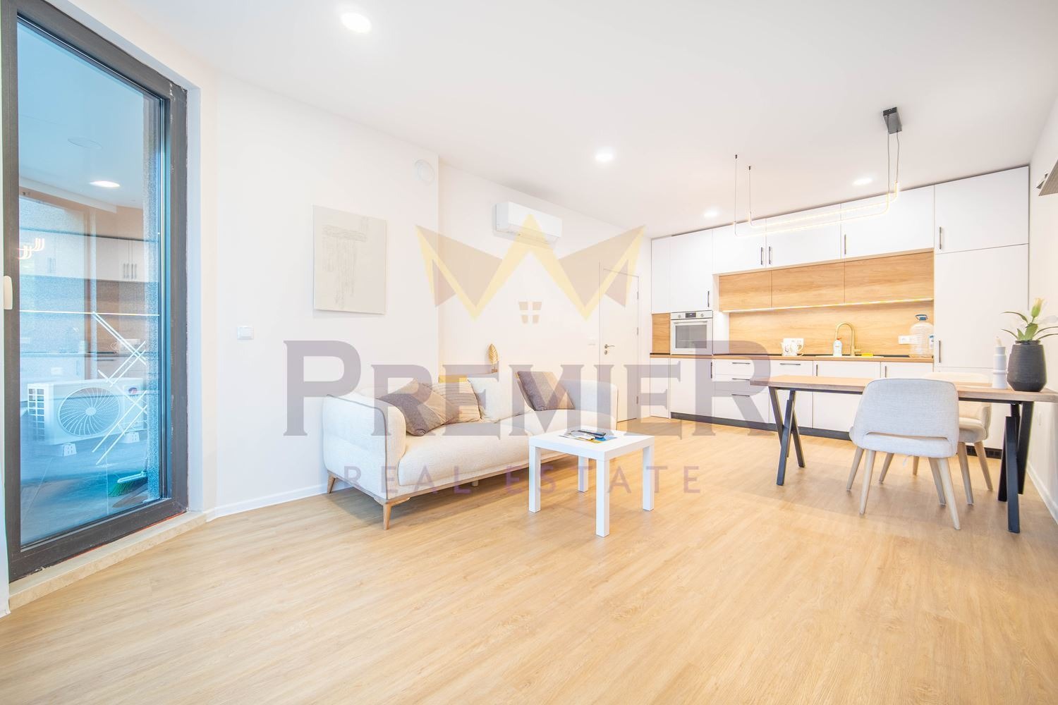 Просторен и светъл дневен тракт с кухненски бокс, обзаведен с модерни мебели и висок клас електроуреди