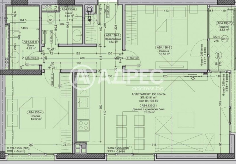 Апартаментът се намира на 3-ти етаж, с изложение запад/север и има обща площ 116.63 кв.м. Състои се от антре, две бани с тоалетни, две спални, всекидневна с кухня, тераса тип лоджия, с излаз от дневната и една от спалните.