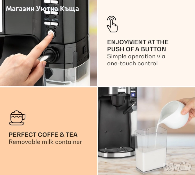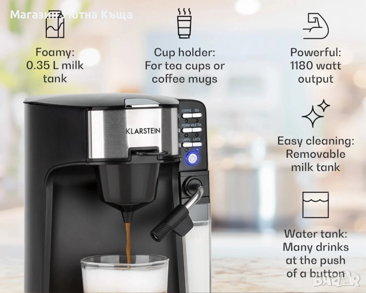 За ценителите на кафето и чая: напълно автоматичната многофункционална кафе-машина Klarstein Baristomat обединява уред за приготвяне на кафе и чай, без да смесват вкусовете.