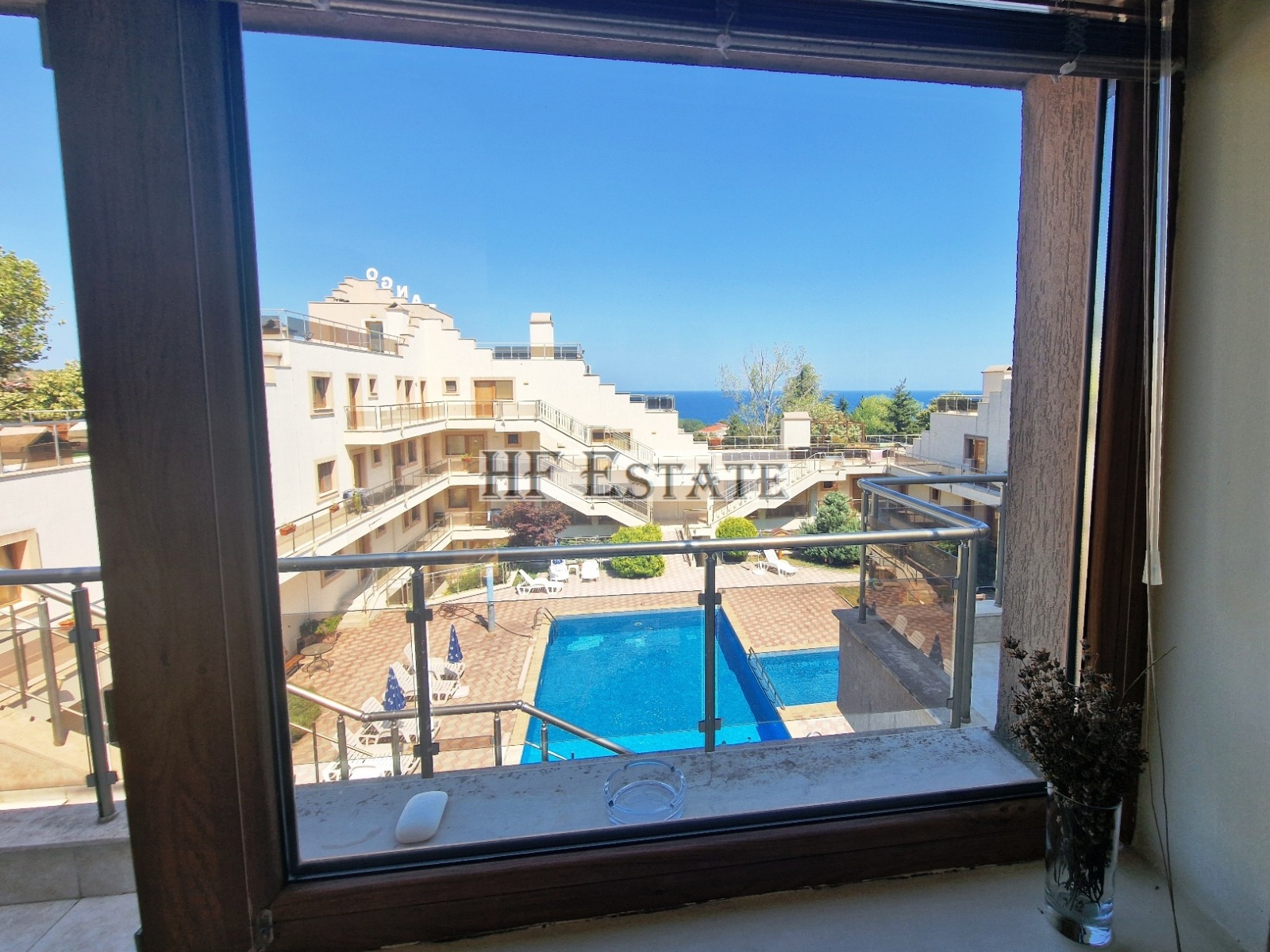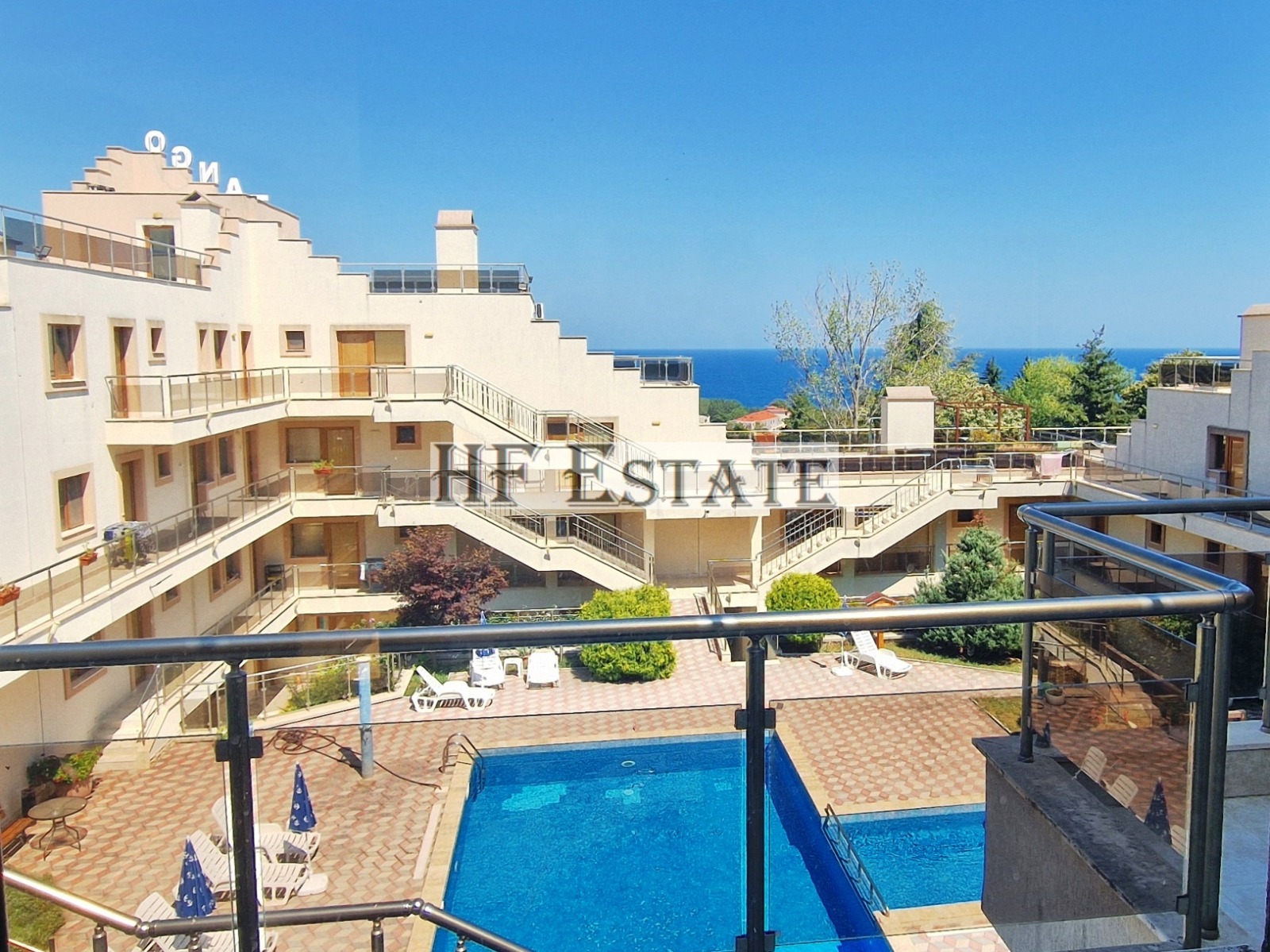 Апартаментът предлага гледка към морето и вътрешността на комплекса.